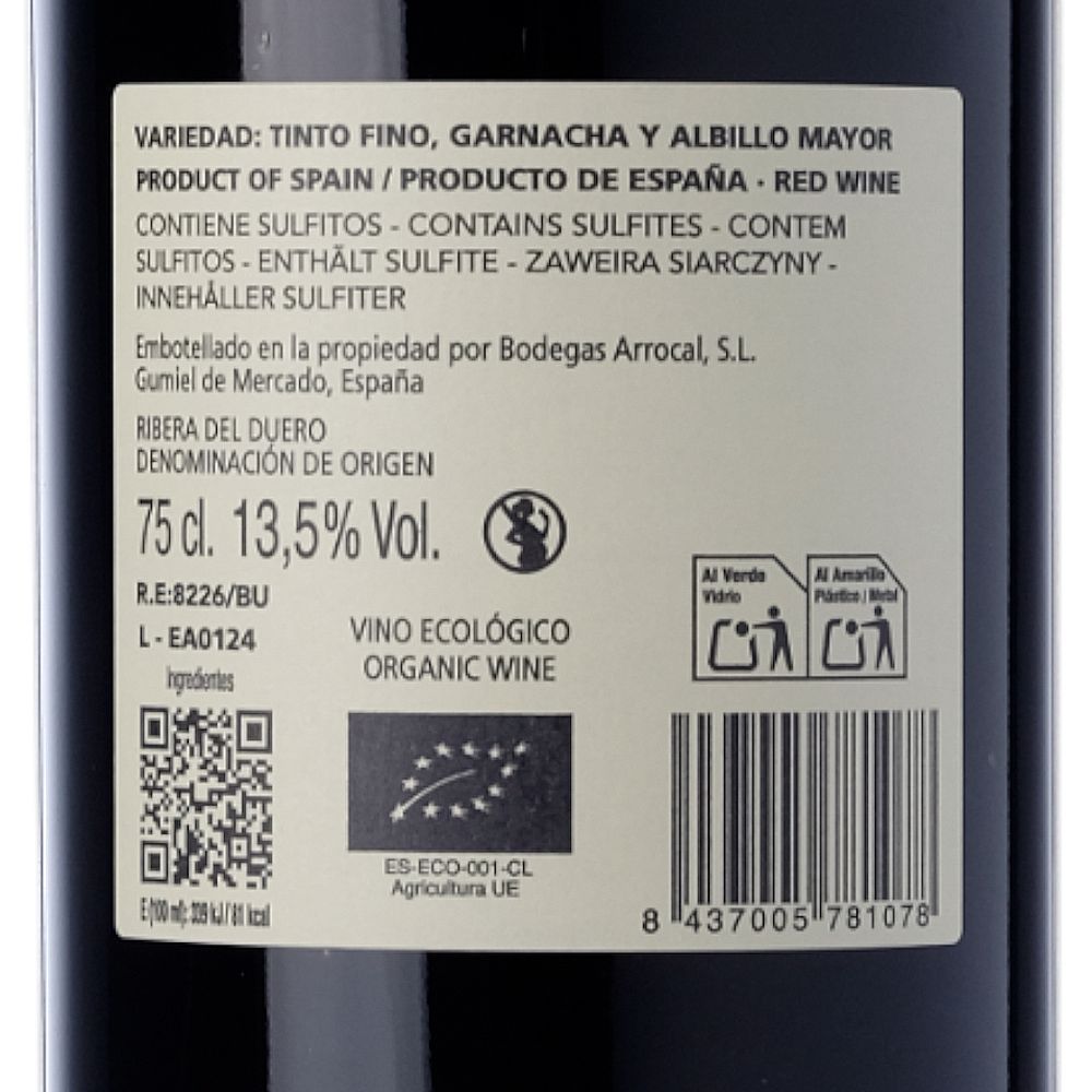 Arrocal Gumiel de Mercado 2024 es un vino tinto seco elaborado a partir de una cuidada mezcla de Tinto Fino, Garnacha y Albillo Mayor, amparado por la D.O. Ribera del Duero. Este vino es fruto del trabajo de Bodegas Arrocal, una bodega familiar ubicada en Gumiel de Mercado, fundada por Rosa Arroyo y Moisés Calvo, viticultores de tercera generación que unieron sus apellidos para dar identidad a su proyecto.
