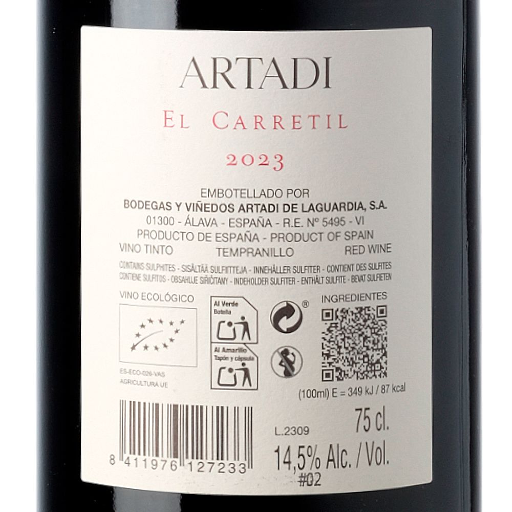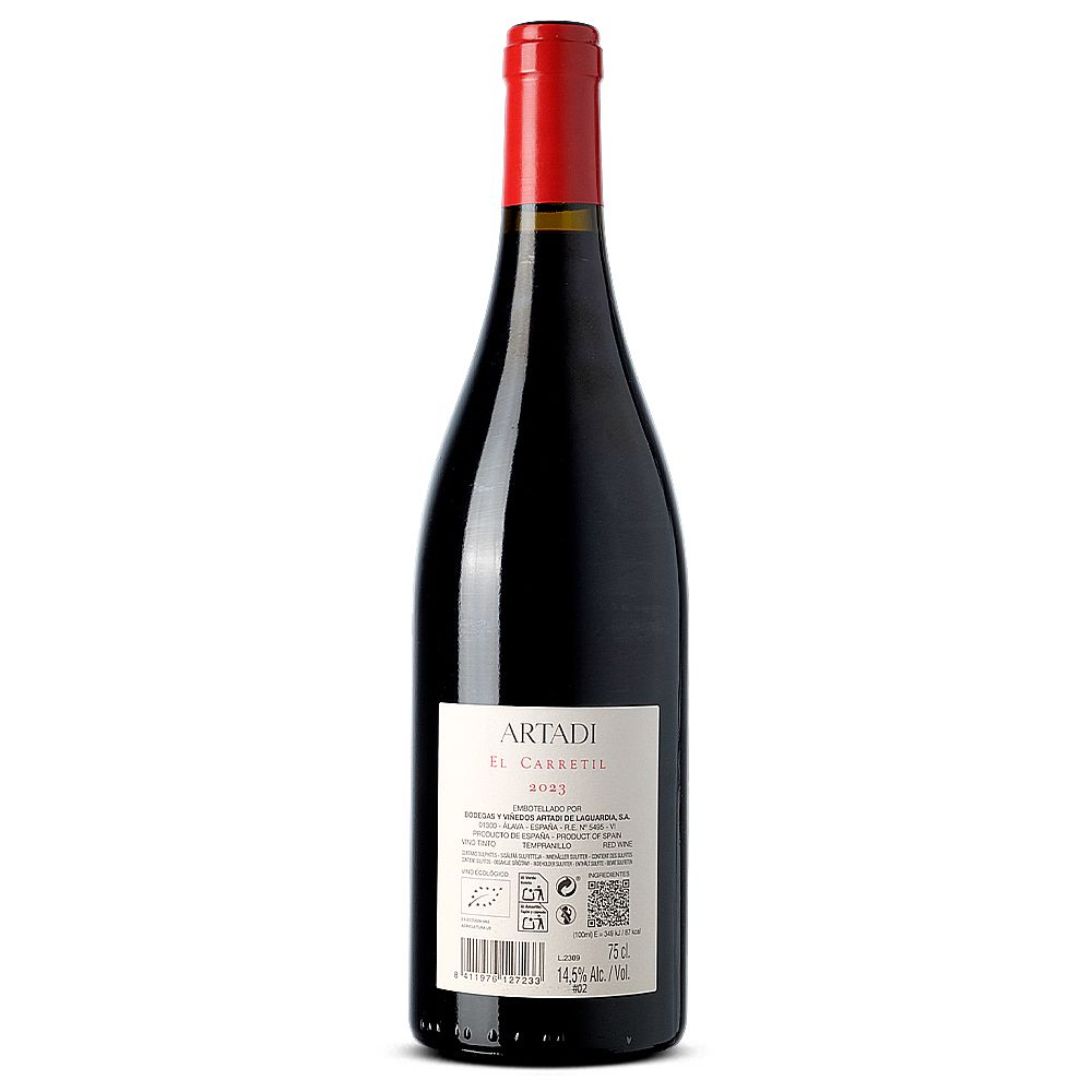 Artadi El Carretil 2023 es un vino tinto de alta gama elaborado íntegramente con uvas Tempranillo, cultivadas bajo estrictos criterios de agricultura ecológica por la reconocida Bodega y Viñedos Artadi, en el corazón de la Rioja Alavesa. Este vino refleja la esencia más pura del Tempranillo riojano, combinando tradición, precisión y un profundo respeto por la tierra.