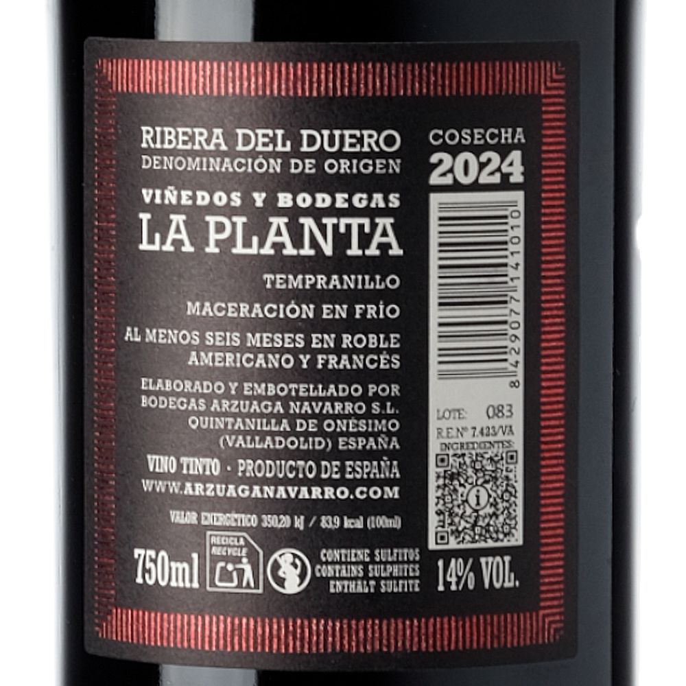 La Planta 2024 proviene de la "Finca La Planta", propiedad de la familia Arzuaga Navarro, localizada a pocos kilómetros de la bodega, en el corazón de la Ribera del Duero. Situada a una altitud de 911 metros, la finca se beneficia de un suelo arcillo-calcáreo y un clima continental, factores que contribuyen significativamente a las características únicas de la uva y, por ende, del vino.