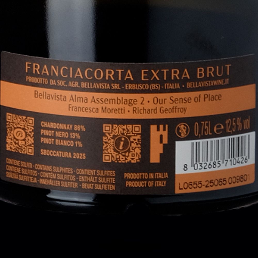 Bellavista Franciacorta Alma Assemblage 2 es un vino espumoso de gran prestigio elaborado a partir de un coupage de 86 % Chardonnay, 13 % Pinot Noir y 1 % Pinot Blanc, amparado por la DOCG Franciacorta, en Lombardía, Italia. Esta referencia emblemática nace en Bellavista, una de las casas más reconocidas de la región, donde se guarda el secreto de un estilo refinado, elegante y fiel al territorio.