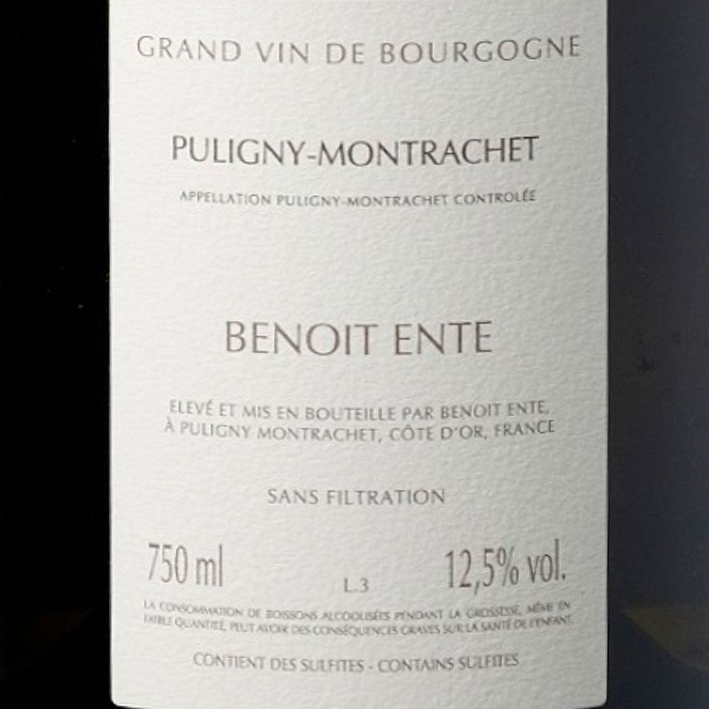 Benoît Ente Puligny-Montrachet 2023 es un vino blanco seco elaborado con Chardonnay procedente de la AOC Puligny-Montrachet, en la Côte de Beaune, Borgoña, Francia. Este vino nace en el proyecto personal de Benoît Ente, un vigneron establecido en Puligny-Montrachet, reconocido por la pureza, precisión y elegancia de sus interpretaciones del Chardonnay. En su estilo se esconde el secreto de una viticultura meticulosa y una enología sin artificios.