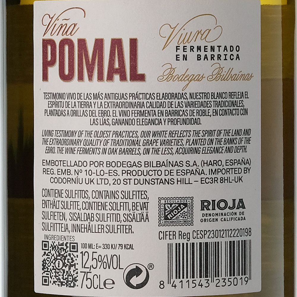 El Viña Pomal Blanco 2024 es un vino blanco seco elaborado con las variedades tradicionales Viura y Malvasía, bajo la prestigiosa D.O.Ca. Rioja. Nace en Bodegas Bilbaínas, fundada en 1901 en el histórico Barrio de la Estación de Haro, la bodega embotelladora más antigua de Rioja, que cuenta con las mayores bodegas subterráneas de la región y más de 250 hectáreas de viñedo propio. Este patrimonio garantiza el abastecimiento exclusivo con uva de calidad y una vinificación rápida que preserva toda su frescura.