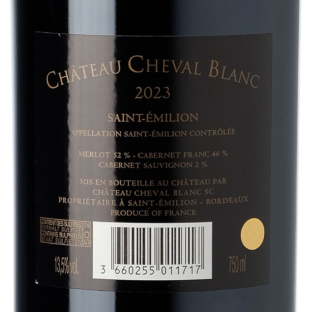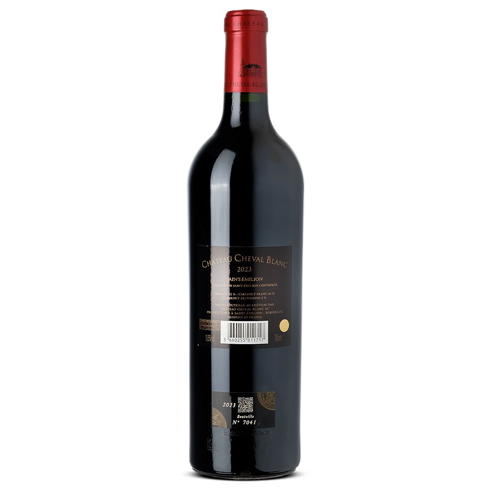Château Cheval Blanc 1er Grand Cru Classé "A" 2023 es un vino tinto seco de alta gama, elaborado con una cuidadosa mezcla de Merlot (52%), Cabernet Franc (46%) y Cabernet Sauvignon (2%). Con una historia vinícola que se extiende por más de seis siglos, Cheval Blanc se asienta en tierras cultivadas con vides desde hace más de 2000 años, con su configuración actual establecida desde mediados del siglo XIV. En los últimos 150 años, la finca ha tenido un único cambio de propietario, lo que ha asegurado una gestión técnica estable y ha preservado la integridad de sus viñedos.