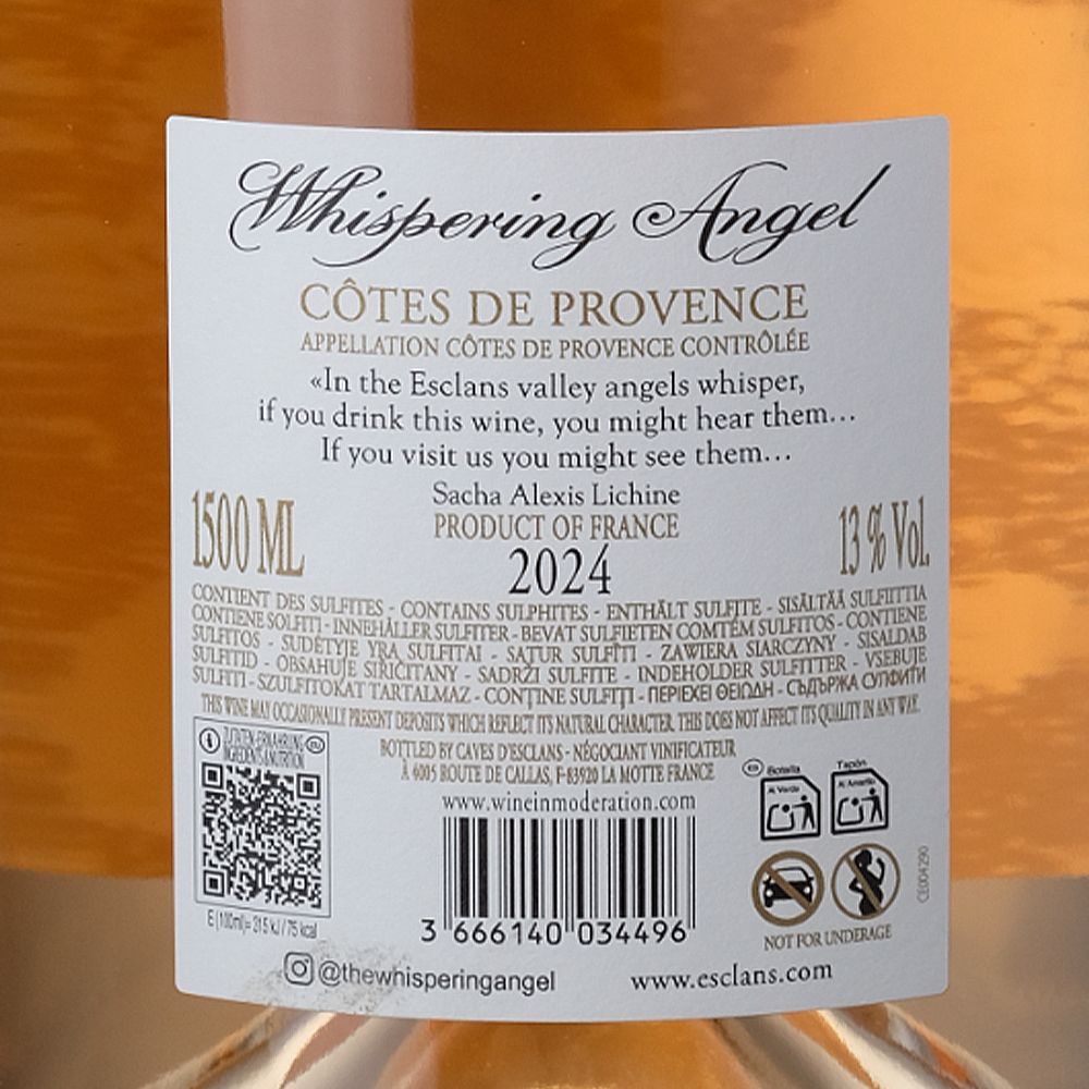 Whispering Angel Rosé 2024, un vino rosado excepcional elaborado por la prestigiosa bodega Château d’Esclans en la región AOC Côtes de Provence (Provenza, Francia). Este rosado, concebido con uvas Garnacha, Cinsault y Rolle (Vermentino), encarna la visión innovadora de Sacha Lichine de crear los mejores vinos rosados del mundo, marcando así el inicio del "Renacimiento rosado".