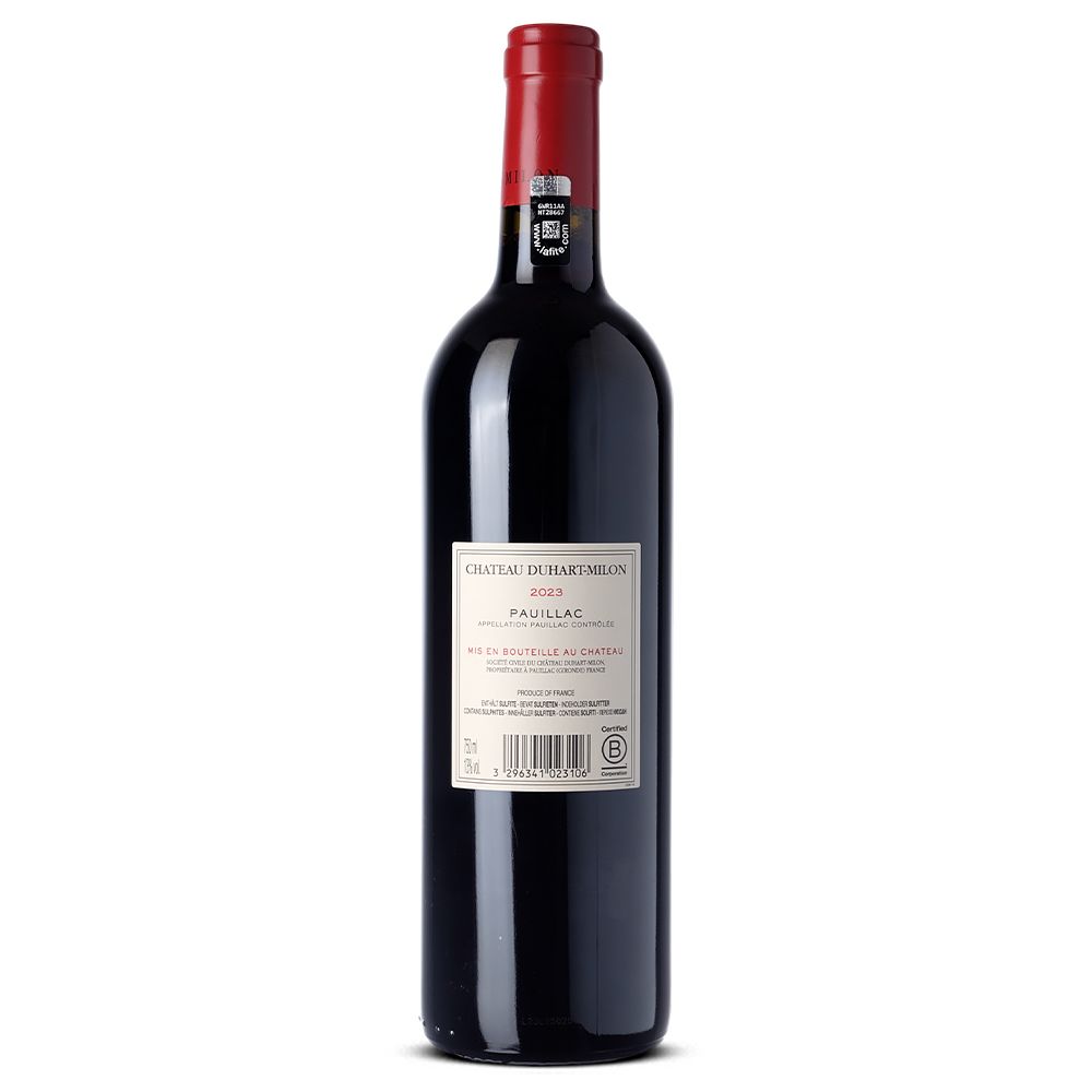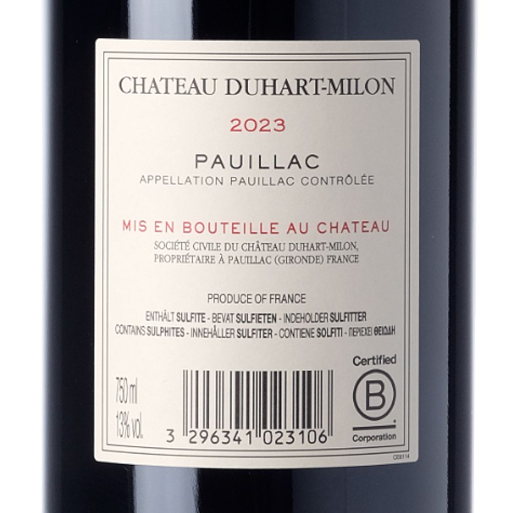 Château Duhart-Milon Grand Cru Classé 2023 es un vino tinto seco de gran distinción. Château Duhart-Milon se encuentra en la prestigiosa denominación de Pauillac, en la región del Médoc, a unos 40 km al norte de Burdeos. Gracias a la influencia moderadora del estuario y la diversidad única de suelos, que combinan elementos del Macizo Central y los Pirineos, Pauillac ofrece condiciones climáticas y geológicas excepcionales para la creación de vinos de calidad superior.