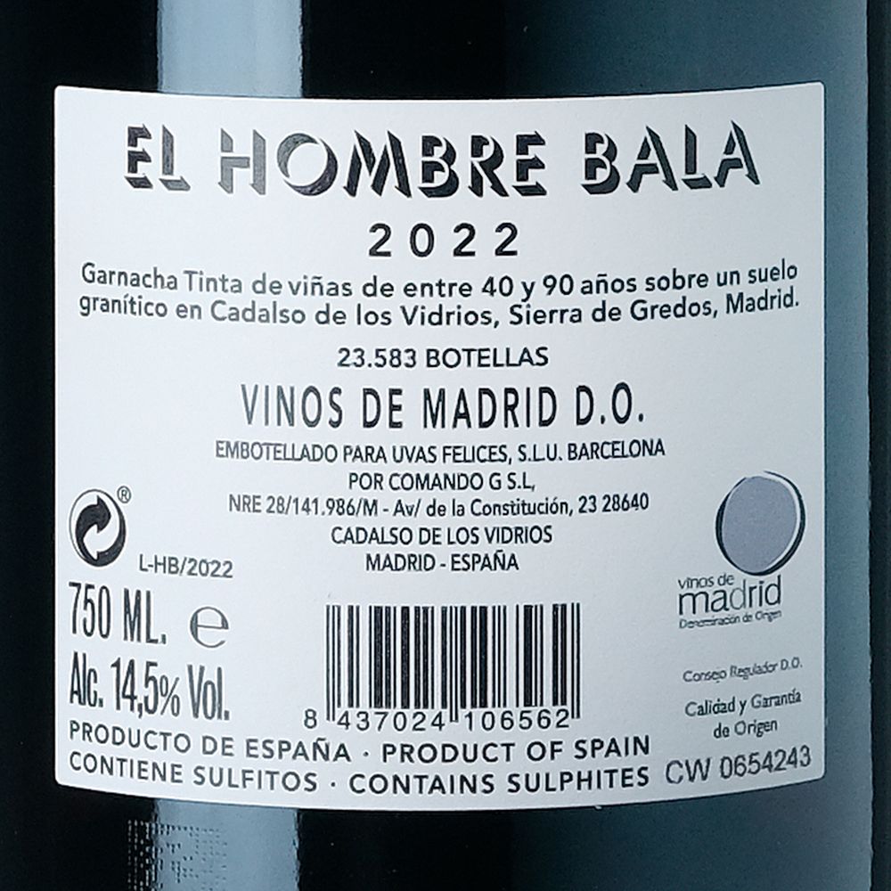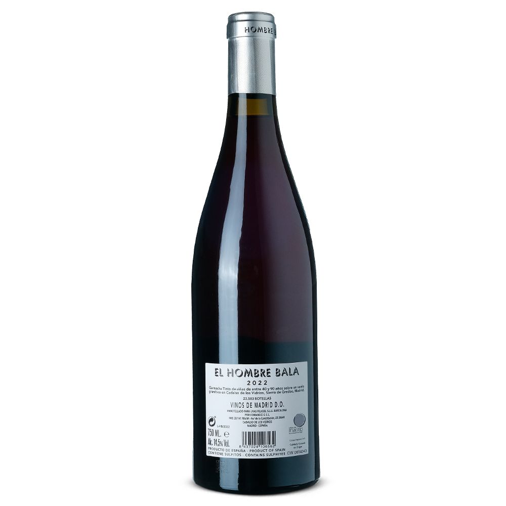 El vino tinto El Hombre Bala 2022 se confecciona con un Garnacha Tinta y Cariñena, cultivados en la Denominación de Origen Vinos de Madrid por el equipo de Comando G. Este proyecto se inició en 2010, cuando los viticultores de Comando G, Fernando García y Daniel Gómez Jiménez-Landi, se asociaron con Vila Viniteca para producir vinos a partir de antiguos viñedos de garnacha. Las uvas para este vino provienen de Peña Cenicientos y Peña Muñana, en Cadalso de los Vidrios (Sierra de Gredos), ubicadas entre 800 y 850 metros sobre el nivel del mar. Los suelos son pobres, graníticos meteorizados con textura arenosa, bajos en materia orgánica y con alto contenido de cuarzo y sílice. La edad de los viñedos varía entre 40 y 90 años.