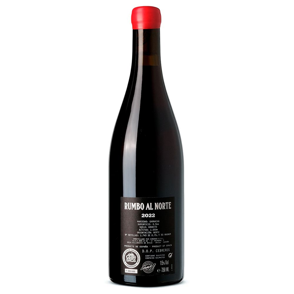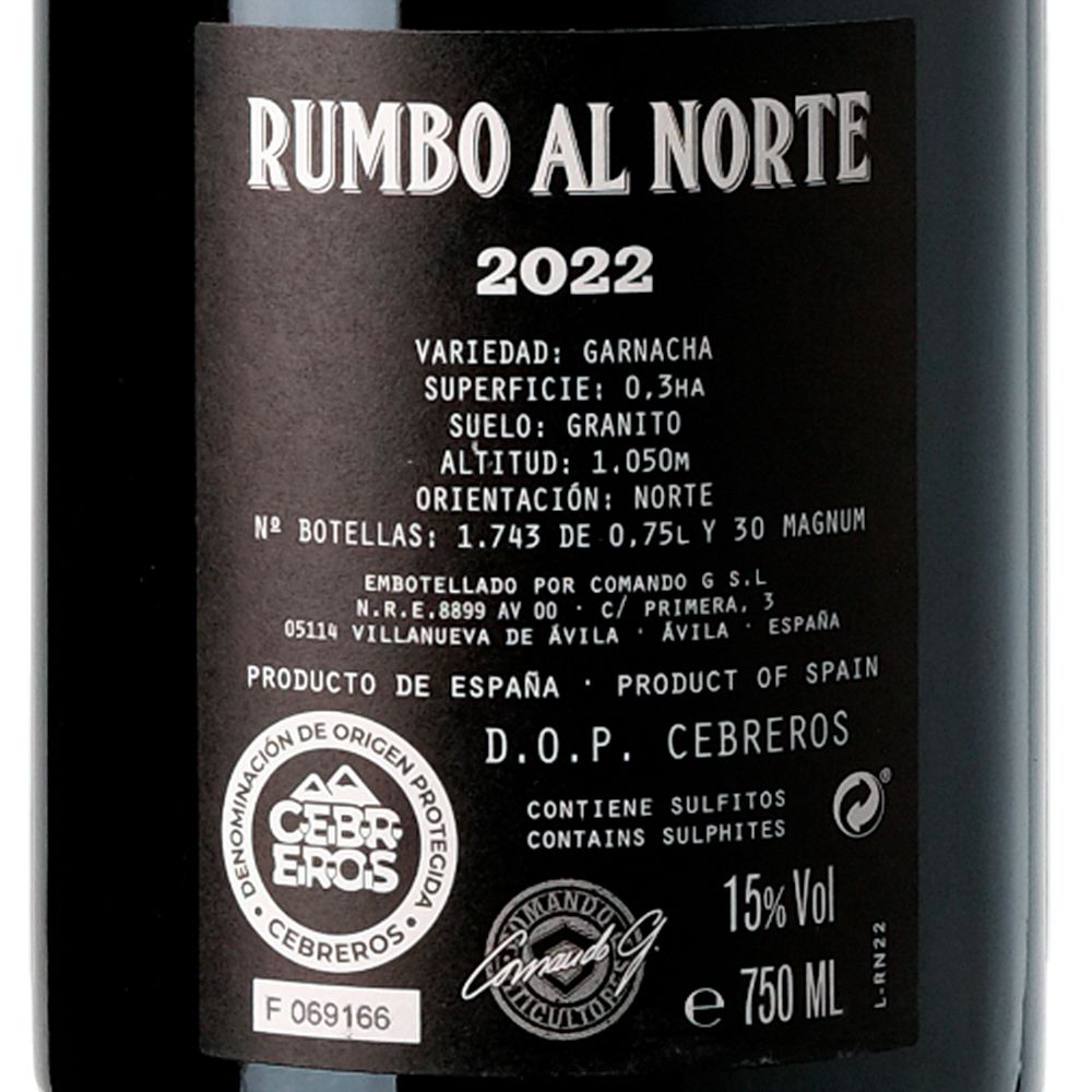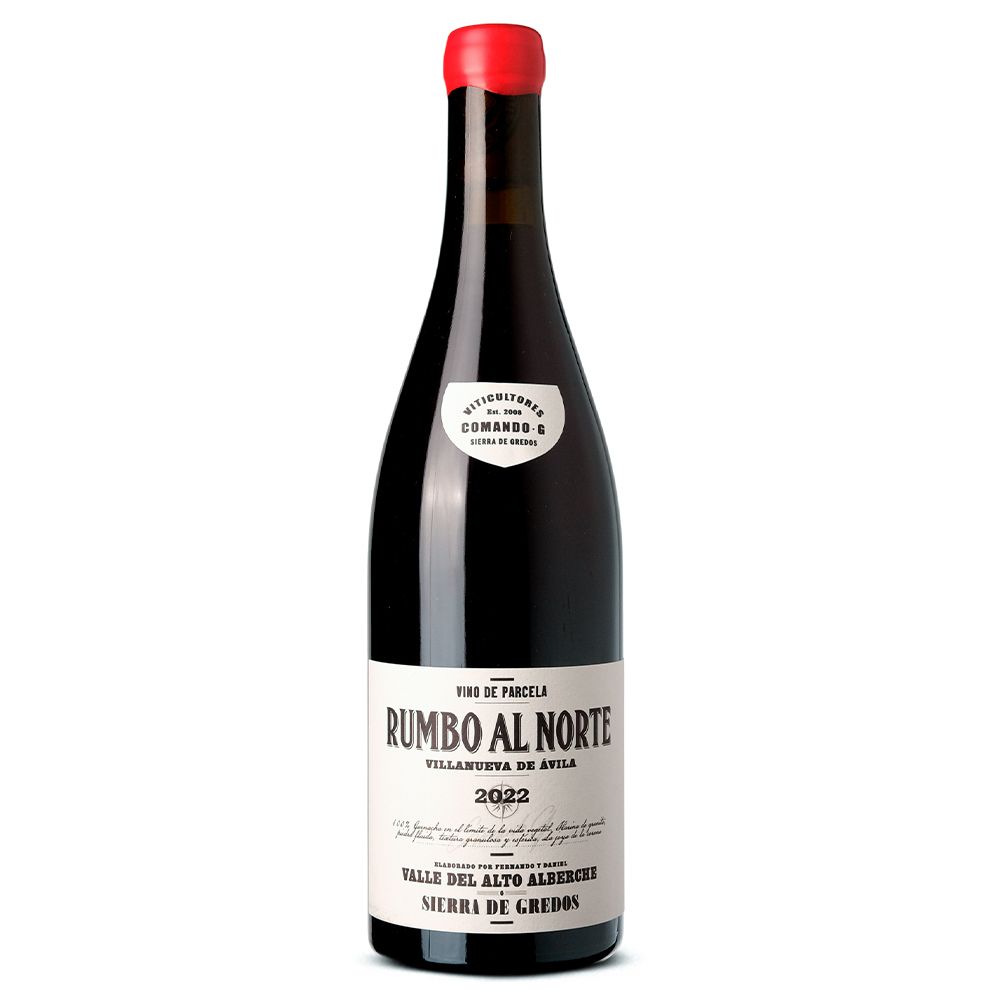 Comando G Rumbo al Norte 2022 es un vino tinto seco elaborado a partir de uva Garnacha en la D.O.P. Cebreros. La bodega, situada en plena Sierra de Gredos a 100 km de Madrid, se ha consolidado como un referente en la creación de Garnachas de altura, gracias a sus viñedos ubicados entre los 900 y 1.200 metros. Su filosofía de trabajo se basa en prácticas orgánicas y biodinámicas que respetan al máximo la pureza del terruño. El microclima de la zona es sorprendentemente suave y húmedo para el centro peninsular, con un entorno montañoso que con frecuencia permanece envuelto en niebla. Esta combinación, unida a la altitud extrema, prolonga el ciclo vegetativo y permite una maduración lenta y completa de la uva.