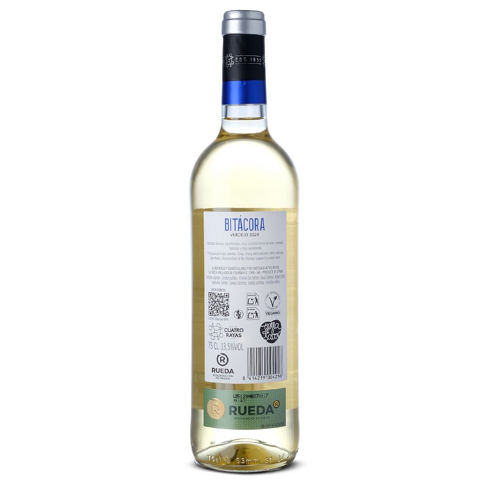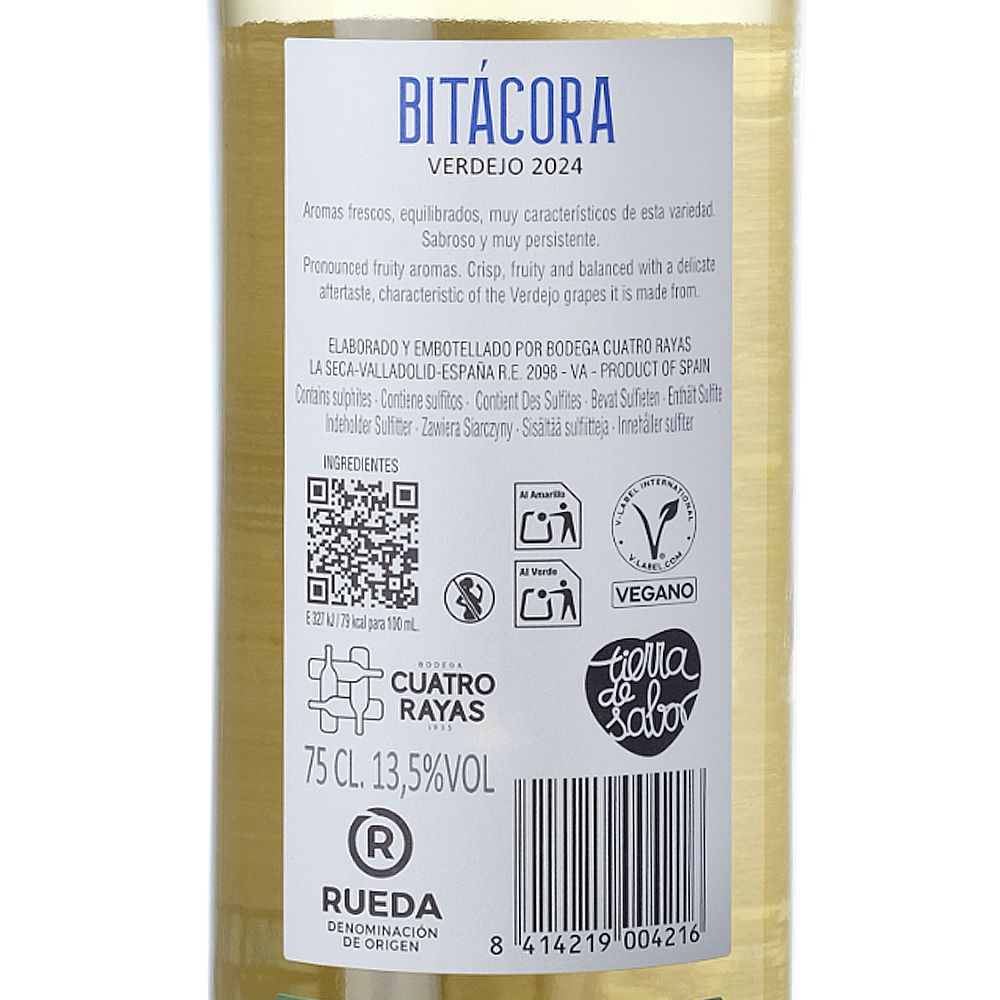 Cuatro Rayas Bitácora Verdejo 2024, un vino blanco confeccionado por la prestigiosa bodega Cuatro Rayas, bajo la denominación de origen D.O. Rueda. Este vino blanco, elaborado con 100% Verdejo, es un testimonio del compromiso y la pasión de más de 40 años de tradición vitivinícola.