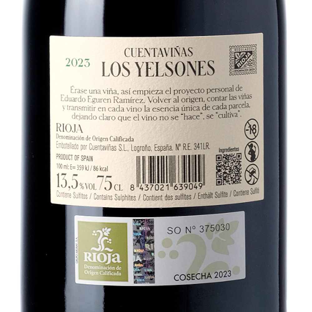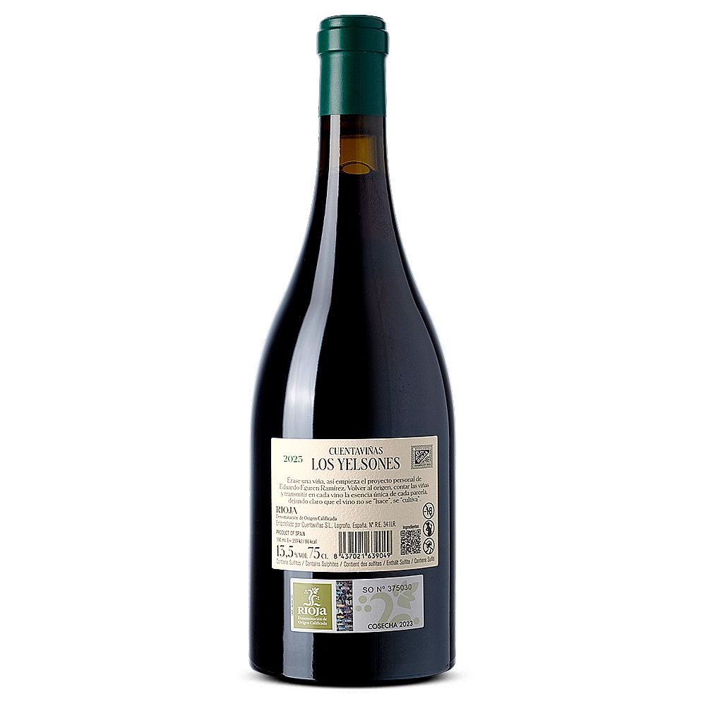 Los Yelsones 2023 es un distinguido vino tinto seco, originario de la D.O.Ca. Rioja y creado por la bodega Cuentaviñas, bajo la dirección de Eduardo Eguren, miembro de la quinta generación de la estimada familia Eguren. Esta familia ha cimentado su reputación en el sector vinícola gracias a su participación en aclamados proyectos como Sierra Cantabria, Viñedos de Páganos y Teso la Monja.