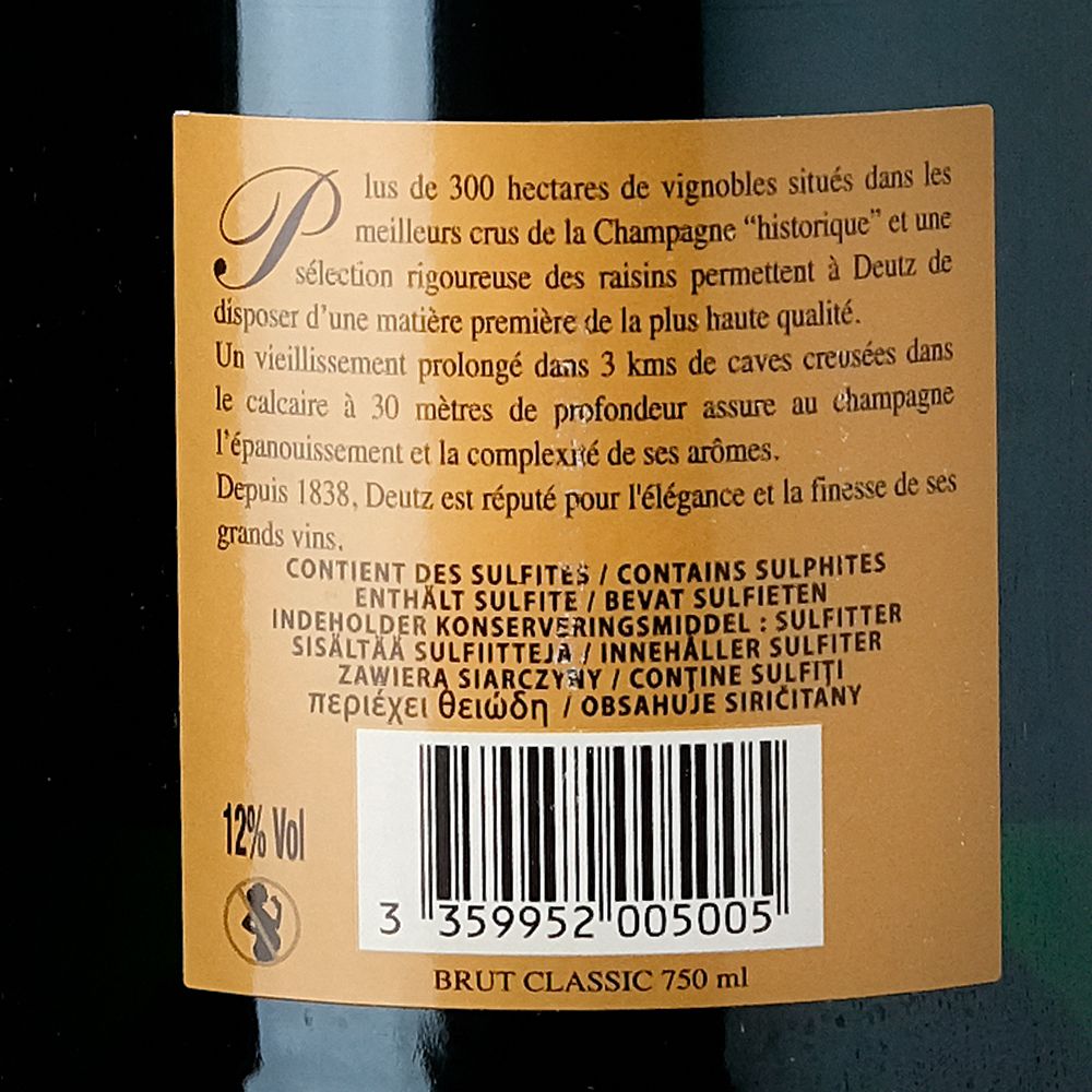 La excelencia del Champagne Deutz Brut Classic se debe a la cuidadosa selección de uvas de primer nivel, procedentes de zonas emblemáticas como Aÿ, Valle del Marne, Côtes des Blancs y Montagne de Reims. Su coupage se compone de un 38% Pinot Noir, 32% Pinot Meunier y 30% Chardonnay, vinificado bajo el tradicional méthode champenoise. Incluye entre un 20% y un 40% de vino de reserva y madura durante 36 meses sobre lías, lo que aporta complejidad y frescura en cada copa. Elaborado con una cuidada mezcla de diferentes añadas, asegura una consistencia sobresaliente en calidad y sabor.