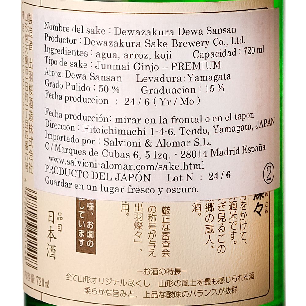 El Dewazakura Dewa Sansan Junmai Ginjo Sake proviene de la prefectura de Yamagata, Japón, y es elaborado por la histórica casa Dewazakura, fundada en 1892 y reconocida por su maestría en la producción de sake artesanal.
