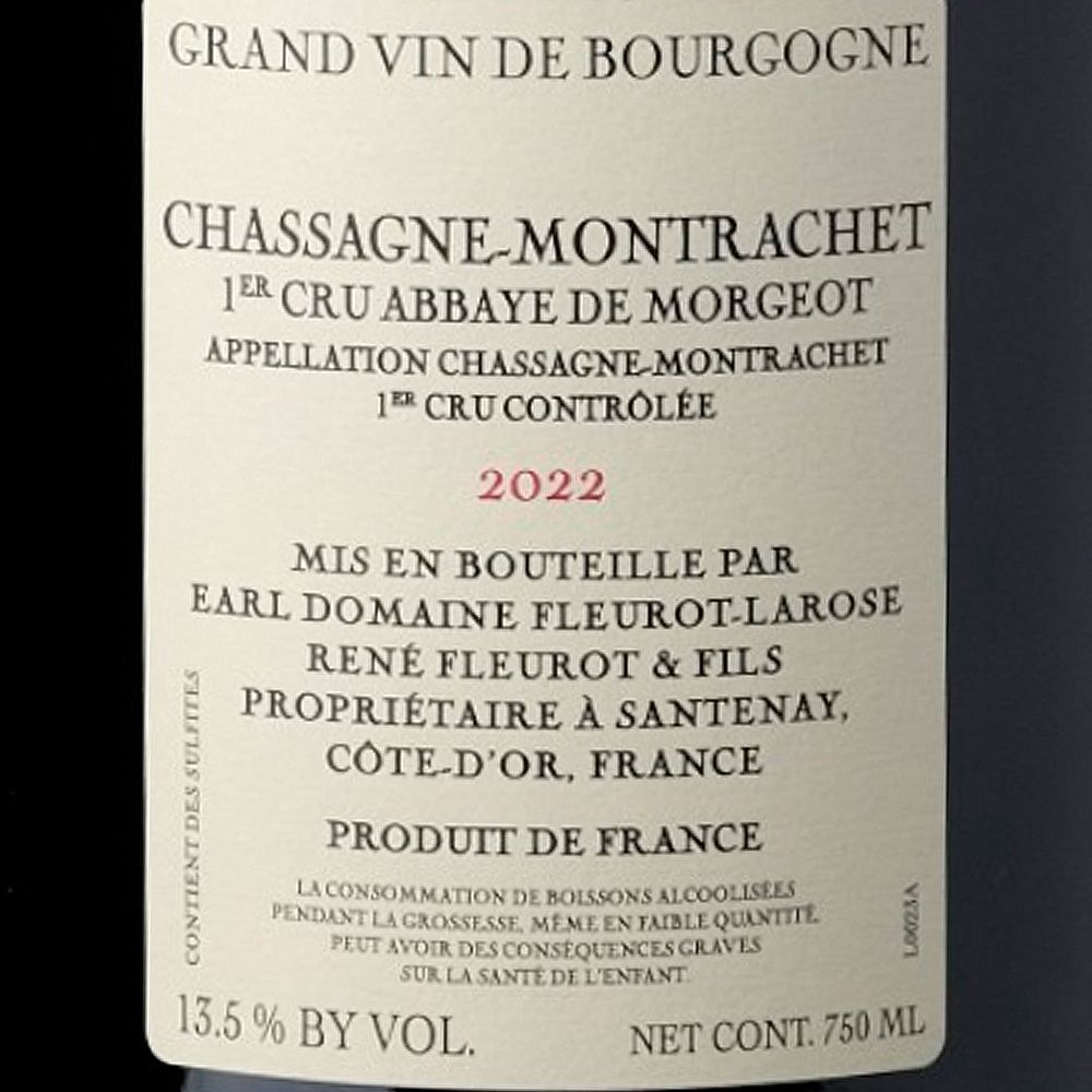 Domaine Fleurot-Larose Chassagne-Montrachet 1er Cru Abbaye de Morgeot Rouge 2022 es un vino tinto seco de categoría Premier Cru, elaborado a partir de Pinot Noir, que refleja la elegancia y profundidad de uno de los grandes terruños de Borgoña. Este vino nace en el histórico Domaine Fleurot-Larose, una bodega familiar fundada en Santenay en 1872 y transmitida con pasión de generación en generación durante más de cuatro generaciones.