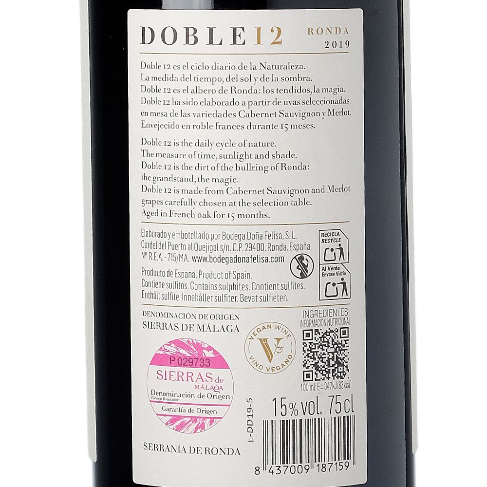 Doble Doce Ronda 2019 es un vino tinto elaborado con Cabernet Sauvignon y Merlot bajo la D.O. Sierra de Málaga por la bodega Bodega Doña Felisa. Su auténtico secreto se encuentra en la singular altitud de sus viñedos, situados a 900 metros sobre el nivel del mar en Ronda, rodeados por los parques naturales de la Sierra de las Nieves, Sierra de Grazalema y Alameda del Tajo. Desde 1999, la familia fundada por José María Losantos y Gema Alonso ha apostado por una viticultura de precisión y respeto absoluto por el entorno.