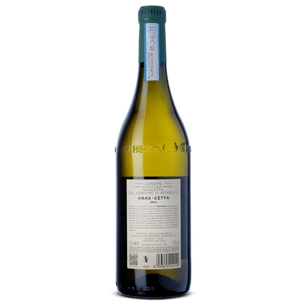 Elvio Cogno Langhe Anas Cëtta 2024 es un vino blanco seco elaborado con 100% Nascetta, una variedad autóctona de la DOC Langhe en Piamonte, Italia. La bodega Elvio Cogno, célebre por la calidad de sus vinos de Langhe, trabaja unas 15 hectáreas de viñedo propio en Novello, uno de los enclaves más valorados para la producción de Barolo DOCG, dentro de la provincia de Cuneo. Este territorio, rico en historia, cultura y paisajes vitivinícolas, ha sido reconocido recientemente como Patrimonio de la Humanidad por la UNESCO.