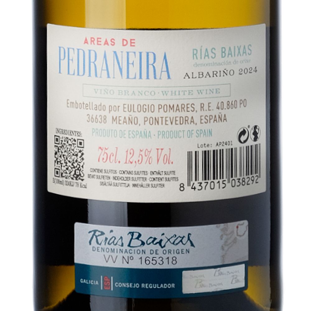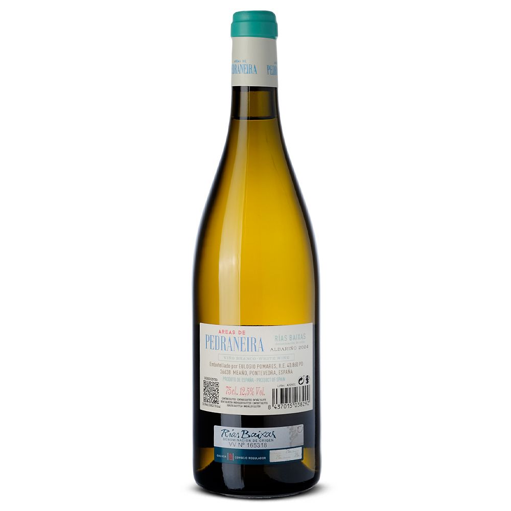 Descubre Areas de Pedraneira 2024, un vino blanco elaborado por Eulogio Pomares (Fento Wines) con la variedad albariño en la parroquia de Castrelo, dentro de Cambados, en la hermosa región de Galicia y perteneciente a la DO Rías Baixas. Este vino toma su nombre de un pequeño islote llamado Francón, situado frente al viñedo, que bordea con el mar, lo que le otorga una estabilidad térmica única que favorece cosechas excepcionales casi todos los años.