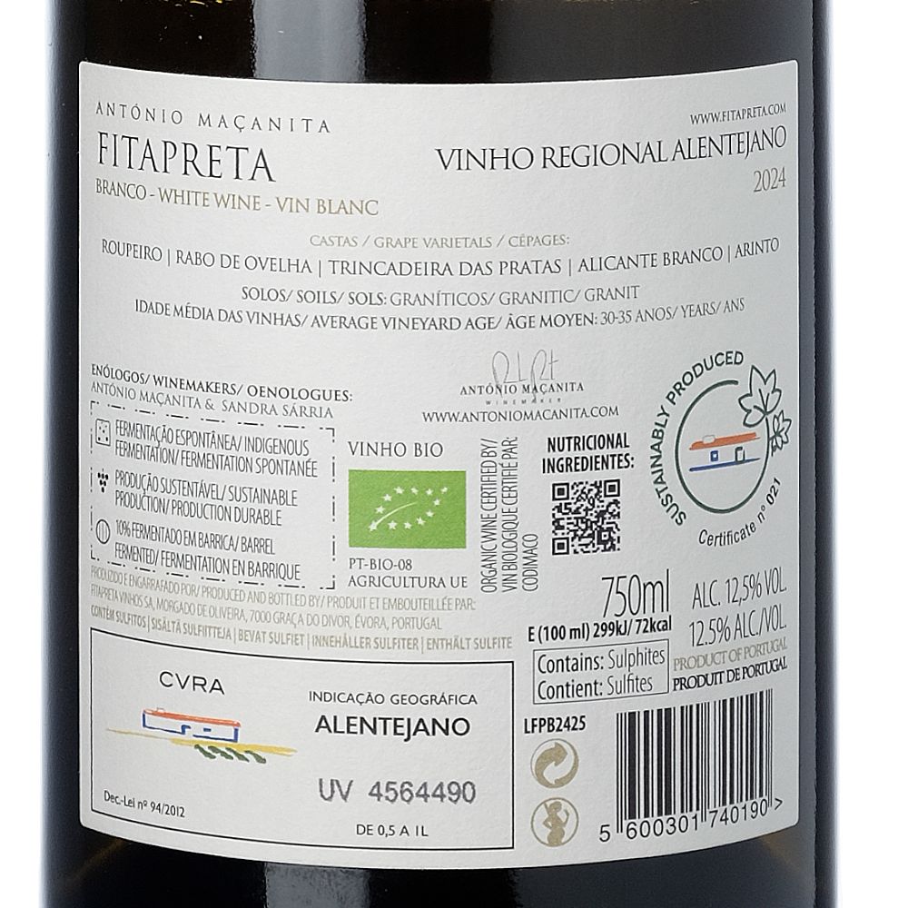 Blend of Arinto, Trincadeira, Rabo de Ovelha, Alicante Branco and Roupeiro. Certified organic farming, limited intervention winemaking. Granite,