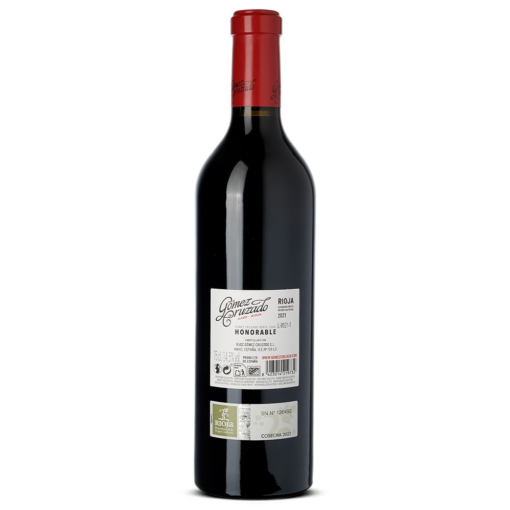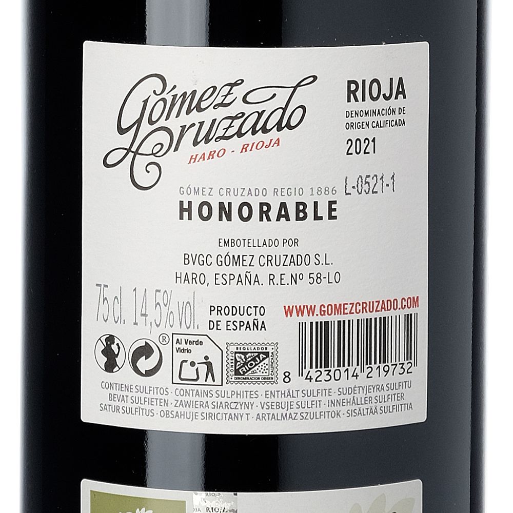 Honorable 2021 es un vino tinto seco elegante y bien estructurado, elaborado por la reconocida bodega Gómez Cruzado en la prestigiosa D.O.Ca. Rioja. Fundada en 1886 por D. Ángel Gómez de Arteche, esta bodega centenaria se estableció en el Barrio de la Estación de Haro, contribuyendo a la evolución del Rioja moderno a finales del siglo XIX.