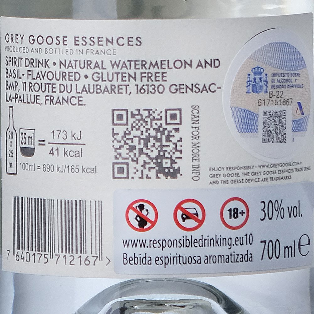 Grey Goose Essences Watermelon & Basil Vodka captura la esencia de los mejores ingredientes de Francia: trigo blando de invierno de Picardie y agua pura de manantial de Gensac, en la región de Cognac. Elaborado con la máxima precisión y elegancia, es un licor único que refleja la excelencia artesanal de la marca.
