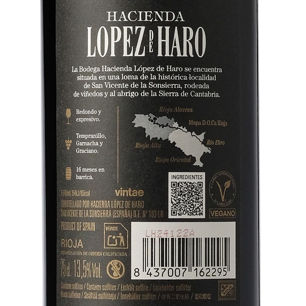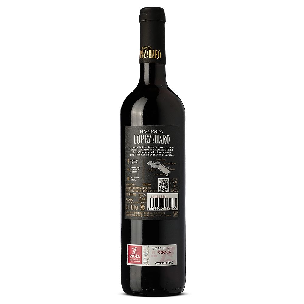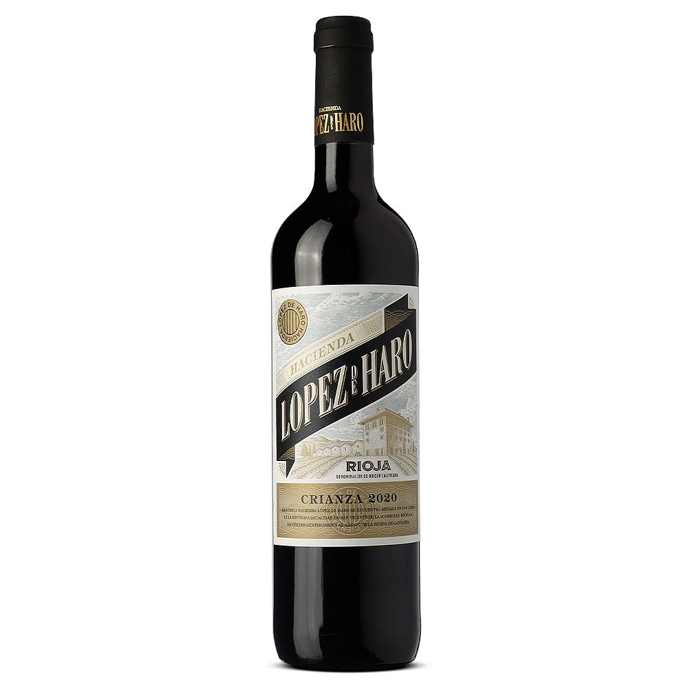 Hacienda López de Haro Crianza 2020 es un vino tinto seco de la prestigiosa D.O.Ca. Rioja, elaborado con un equilibrado coupage de Tempranillo, Garnacha y Graciano. Proveniente de la reconocida bodega Hacienda López de Haro, situada en San Vicente de la Sonsierra, una zona privilegiada en la Rioja Alta, donde el viñedo se beneficia de un microclima ideal gracias a la protección de la Sierra de Cantabria y la humedad reguladora del río Ebro.