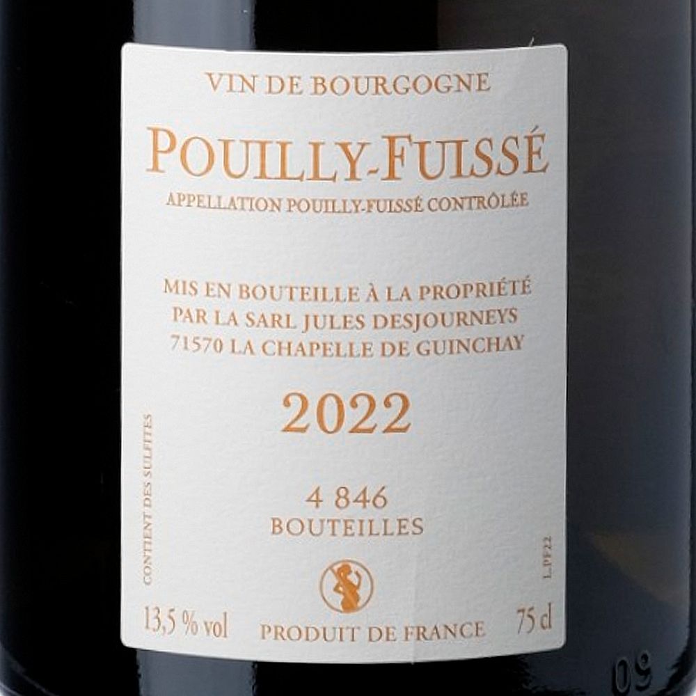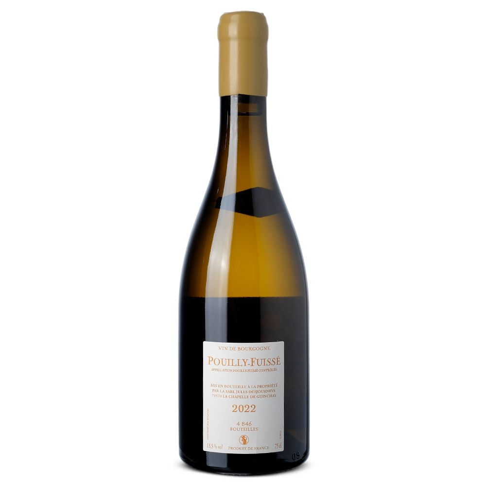 Jules Desjourneys Pouilly-Fuissé 2022 es un vino blanco seco elaborado con uva Chardonnay bajo la prestigiosa AOC Pouilly-Fuissé, en Borgoña (Francia). Procedente de Domaine Jules Desjourneys, bodega situada en el sur de Borgoña, este productor trabaja cuidadosamente parcelas en las regiones de Mâconnais y Beaujolais. Actualmente cultiva 7 hectáreas en Beaujolais y 10 hectáreas en Mâconnais, elaborando no solo vinos de Fleurie y Moulin-à-Vent, sino también reconocidas etiquetas de Pouilly-Fuissé, Pouilly-Vinzelles, Mâcon Prissé y Mâcon Verzé. La viticultura se rige por principios biodinámicos y todas las labores se realizan manualmente, garantizando la máxima expresión del terroir.