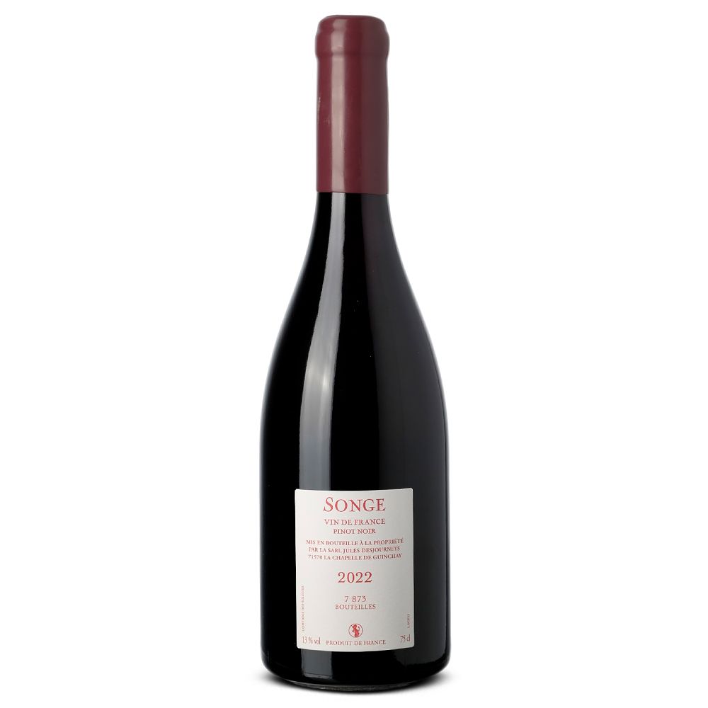 Jules Desjourneys Songe 2022 es un vino tinto seco elaborado con la variedad Pinot Noir, que refleja la elegancia y finura características de esta uva. Procede de Domaine Jules Desjourneys, una bodega ubicada en el sur de Borgoña, conocida por su trabajo en las denominaciones de origen de Mâconnais y Beaujolais.