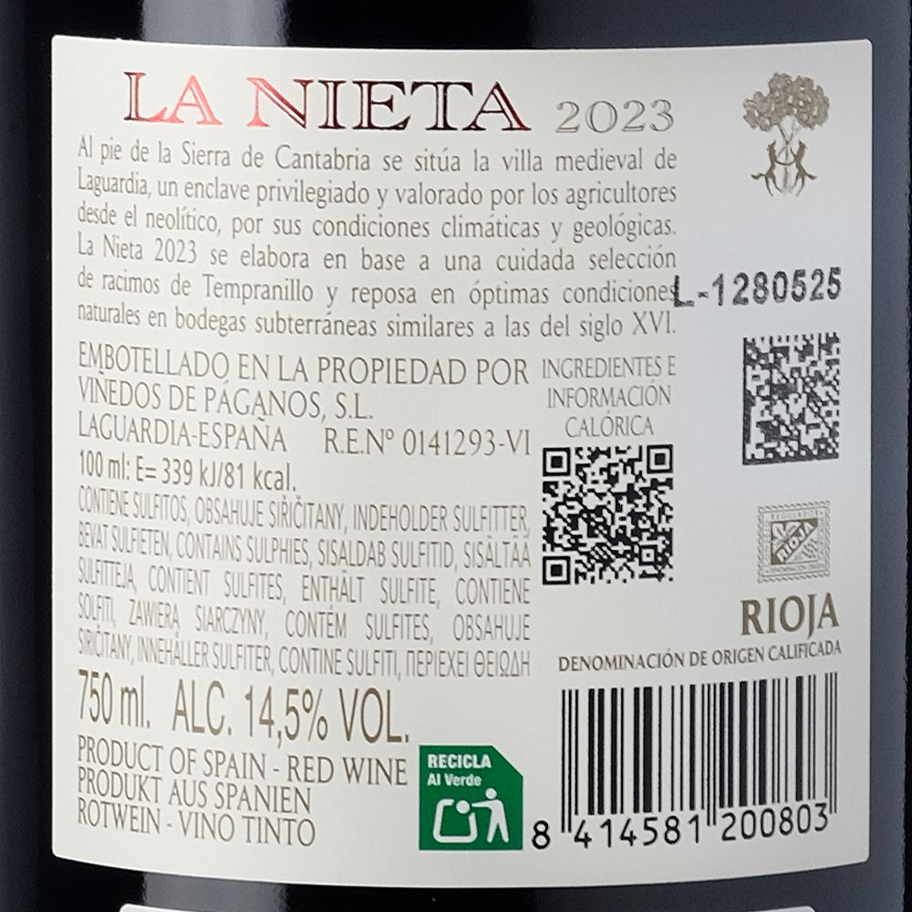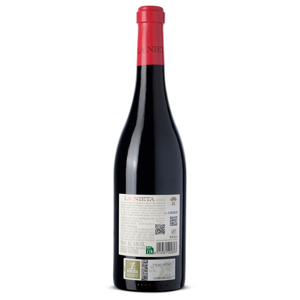 La Nieta 2023, elaborada exclusivamente con uvas Tempranillo, proviene de los viñedos de la prestigiosa bodega Viñedos de Paganos, ubicada en La Rioja. Este excepcional vino es fruto de la dedicación de Viñedos de Páganos, una bodega destacada dentro de Sierra Cantabria. Las uvas Tempranillo de La Nieta se cosechan en el singular viñedo Finca La Nieta, con una extensión de 1,75 hectáreas en Páganos y Laguardia, a una altitud de 525 metros y plantado en 1975. El suelo, de textura franco arcillo-limosa, cuenta con un subsuelo de roca arenisca, alta densidad de plantación y baja producción por hectárea. Además, se emplea abonado orgánico y se sigue un enfoque de viticultura biodinámica.