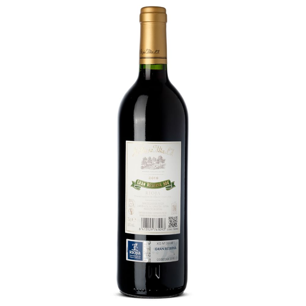 La Rioja Alta Gran Reserva 904, cosecha 2016 es un vino tinto seco emblemático, elaborado a partir de una cuidada mezcla de Tempranillo (90 %) y Graciano (10 %) procedente de viñedos seleccionados de la prestigiosa D.O.Ca. Rioja. El Tempranillo nace en parcelas históricas situadas en Villalba, Briñas y Rodezno, mientras que el Graciano tiene su origen en la reconocida finca Montecillo, en Fuenmayor. La bodega La Rioja Alta, fundada en 1890 por familias riojanas y vascas, es una referencia indiscutible del clasicismo y la excelencia en el mundo del vino.