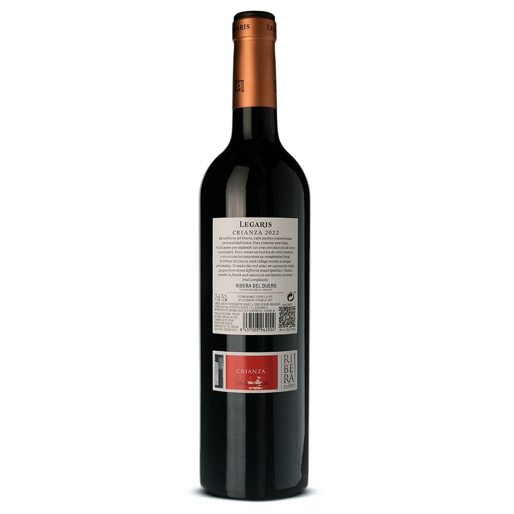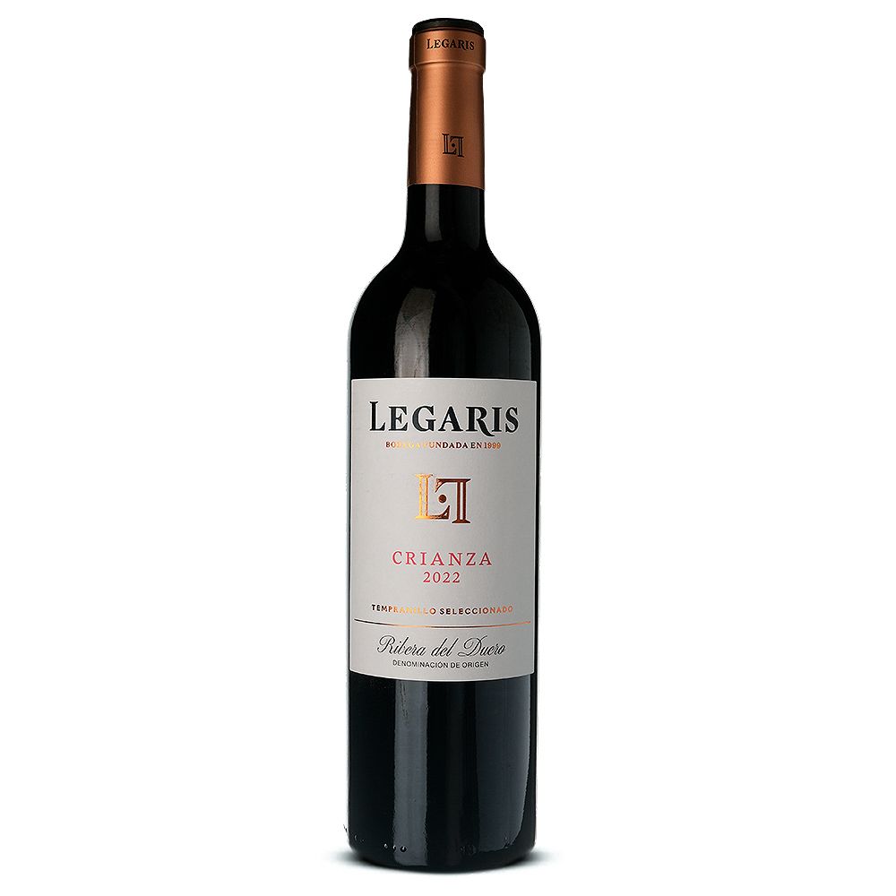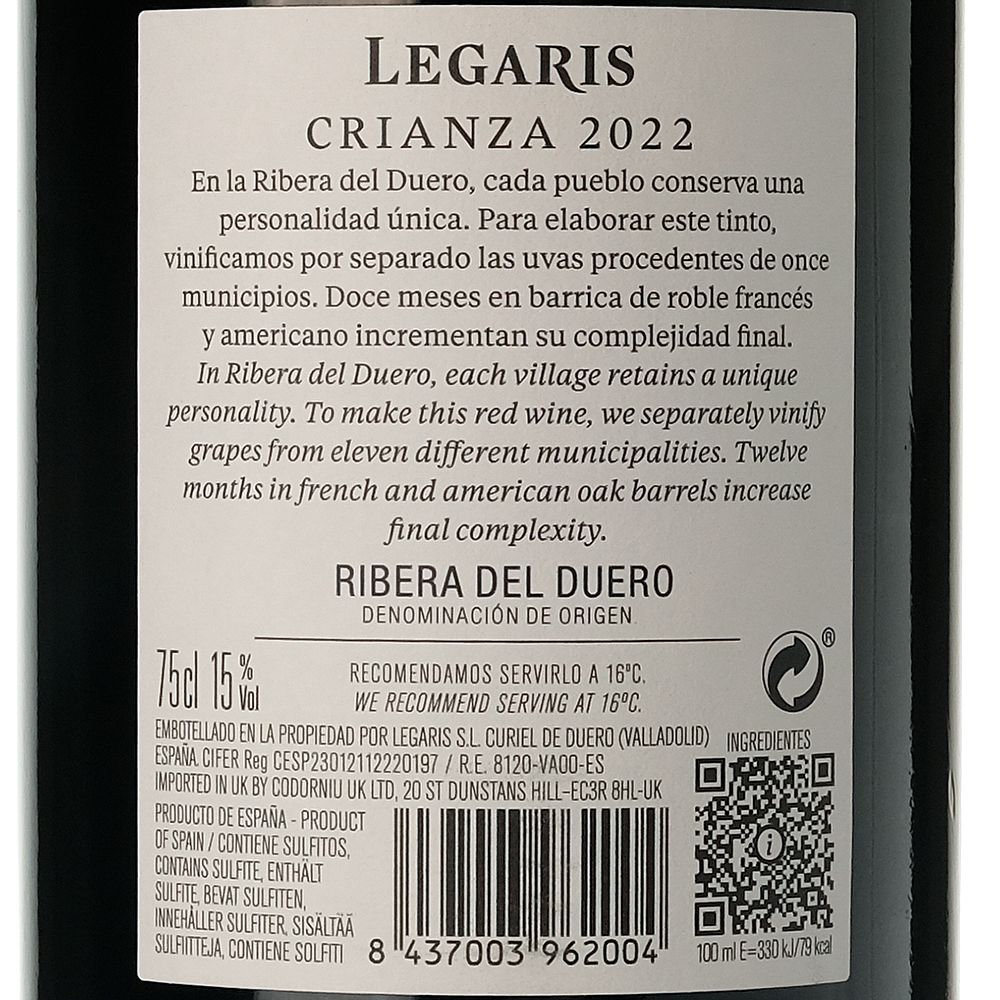 El Legaris Crianza 2022 es un vino tinto seco elaborado con Tempranillo y Cabernet Sauvignon bajo la D.O. Ribera del Duero. Procede de viñedos seleccionados en Valladolid y Burgos, situados entre 750 y 970 metros de altitud, en suelos arcillo-calcáreos que aportan carácter y mineralidad.