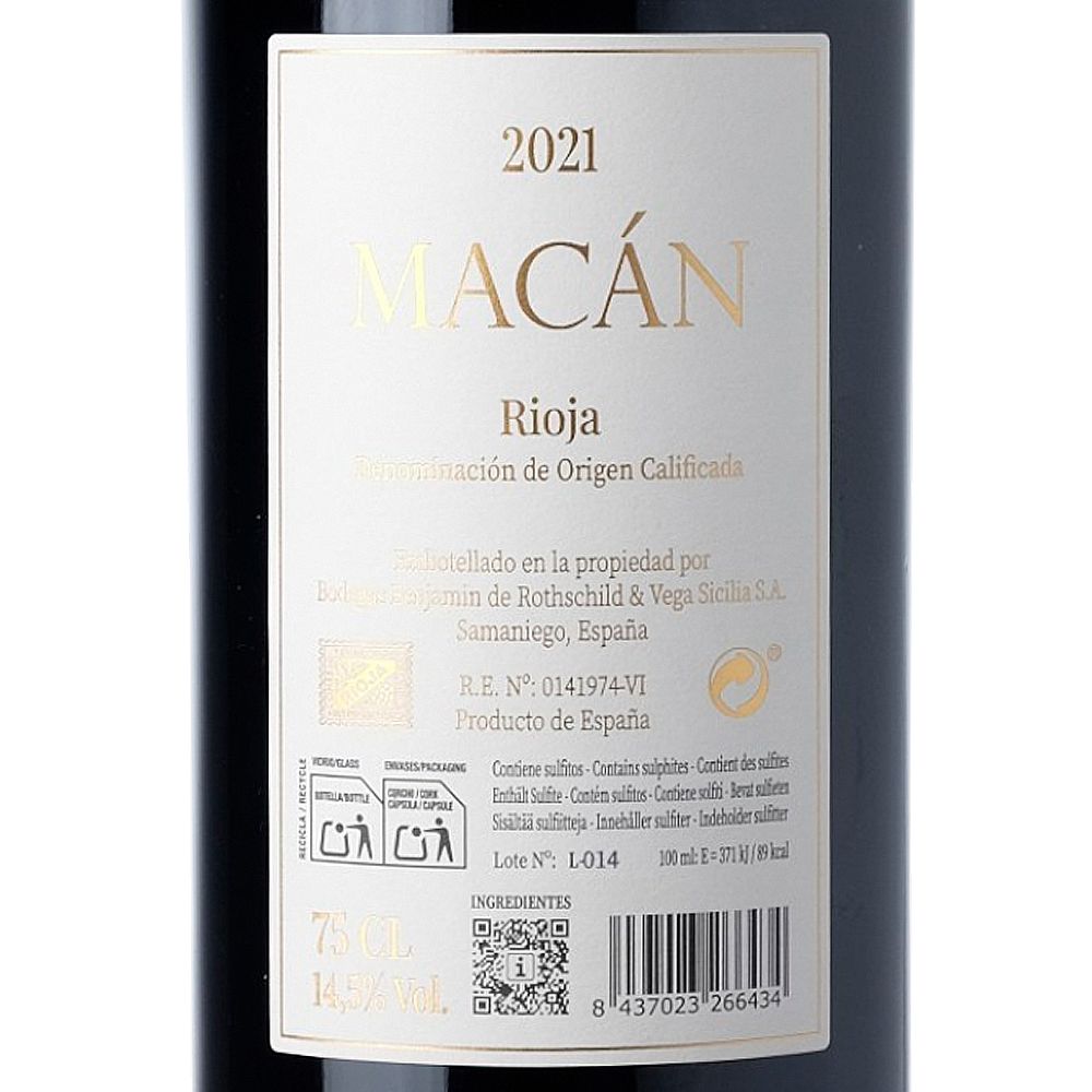 Macán 2021 es un vino tinto de gran elegancia elaborado principalmente con Tempranillo (99%) y una pequeña proporción de Graciano (1%), procedente de la prestigiosa D.O.Ca. Rioja. Este vino es fruto de la colaboración entre Tempos Vega Sicilia y la Compañía Vinícola Barón Edmond de Rothschild, dando origen a la bodega en 2004. La visión compartida de producir vinos excepcionales en la única región vitícola de Rioja tomó forma en 2009 con las primeras añadas de Macán y Macán Clásico, consolidándose en 2013 con el lanzamiento definitivo de la marca.