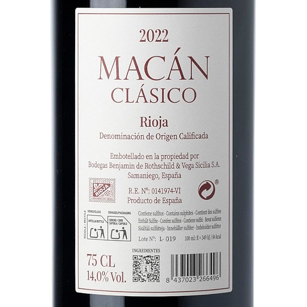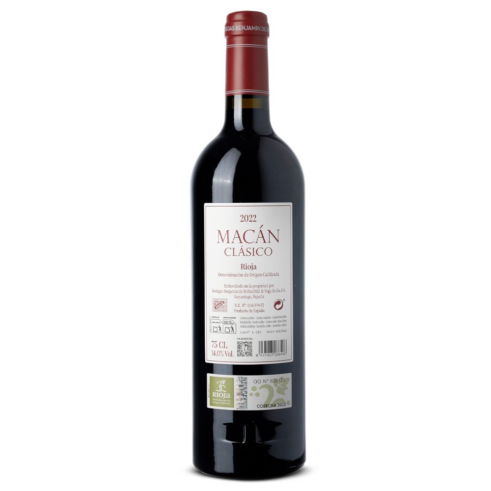 Macán Clásico 2022 es un vino tinto de gran carácter, elaborado principalmente con Tempranillo (99%) y una pequeña proporción de Garnacha (1%), procedente de la prestigiosa D.O.Ca. Rioja y producido por Macán Bodegas Benjamin de Rothschild & Vega Sicilia. Esta bodega, fruto de la colaboración entre Tempos Vega Sicilia y la Compañía Vinícola Barón Edmond de Rothschild en 2004, comparte la visión de crear vinos únicos en la región vinícola inimitable de Rioja. Tras cinco años de estudio de terroirs y adquisición de viñedos, el proyecto cobra vida en 2009 con la primera cosecha de Macán y Macán Clásico. La marca se presenta oficialmente en 2013, marcando la entrada de las primeras botellas al mercado.