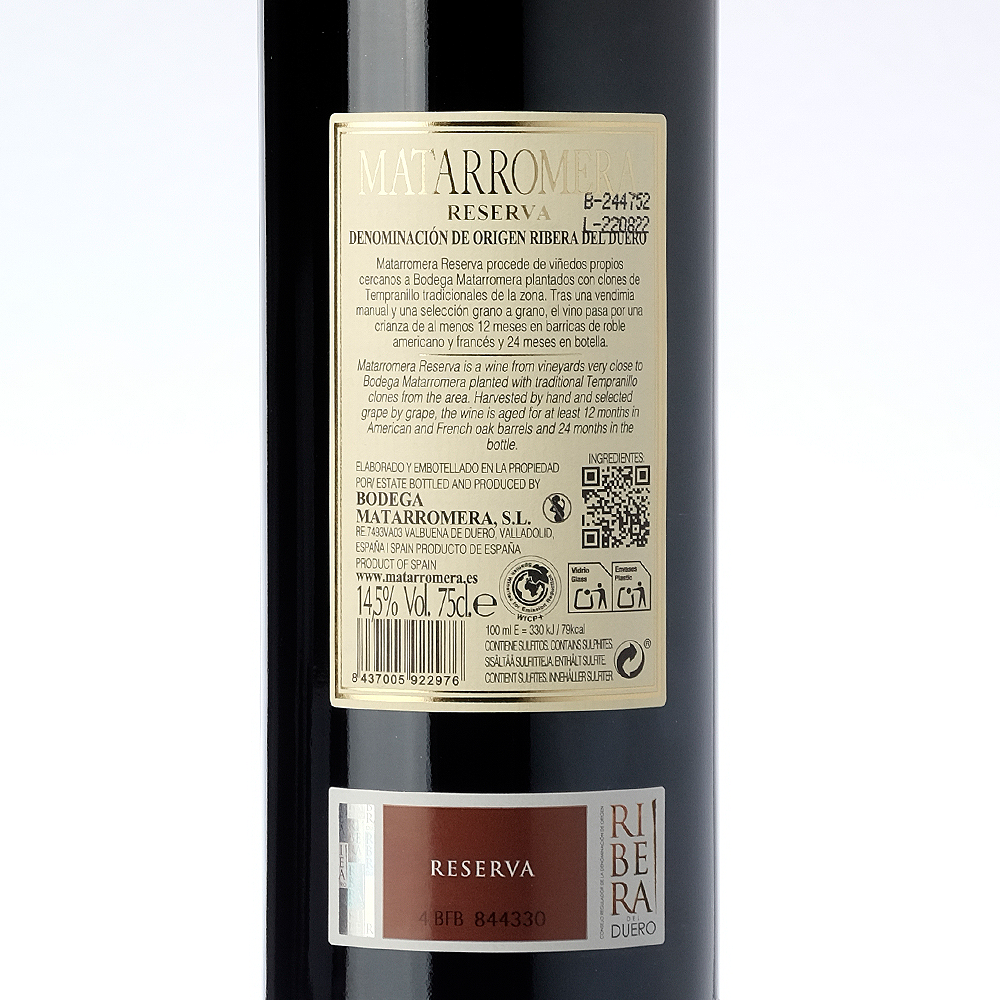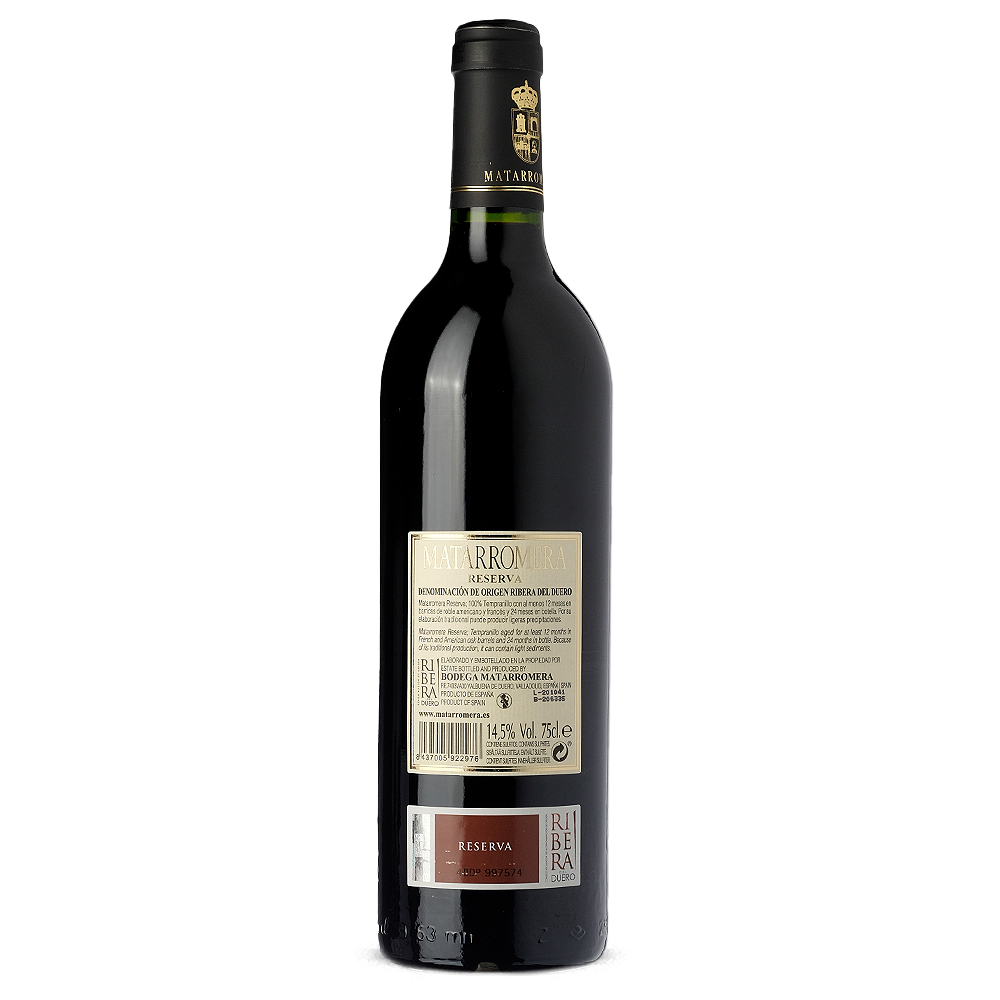 Matarromera Reserva 2019 es un vino tinto seco de gran calidad, elaborado con uvas Tempranillo por la reconocida bodega Matarromera en la prestigiosa región D.O. Ribera del Duero. Situada en Valbuena de Duero (Valladolid), en el corazón de la Ribera del Duero, esta bodega cuenta con espectaculares vistas al río Duero. Desde su fundación en 1988, Matarromera ha alcanzado un éxito internacional gracias a su compromiso con la excelencia, donde se combinan tradición e innovación en cada botella.