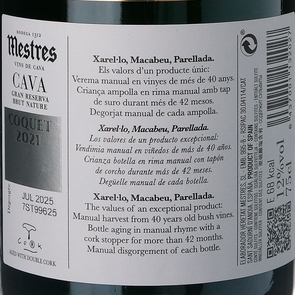 Mestres Coquet Gran Reserva Brut Nature 2021, disponible para comprar en nuestra tienda online, es un espumoso excepcional de la D.O. Cava, elaborado con las variedades Macabeo, Parellada y Xarel·lo. Este cava proviene de una tradición familiar que se remonta a 1312, con viñedos propios en Sant Sadurní d’Anoia, donde el compromiso con la excelencia ha guiado la producción de sus reconocidos espumosos.