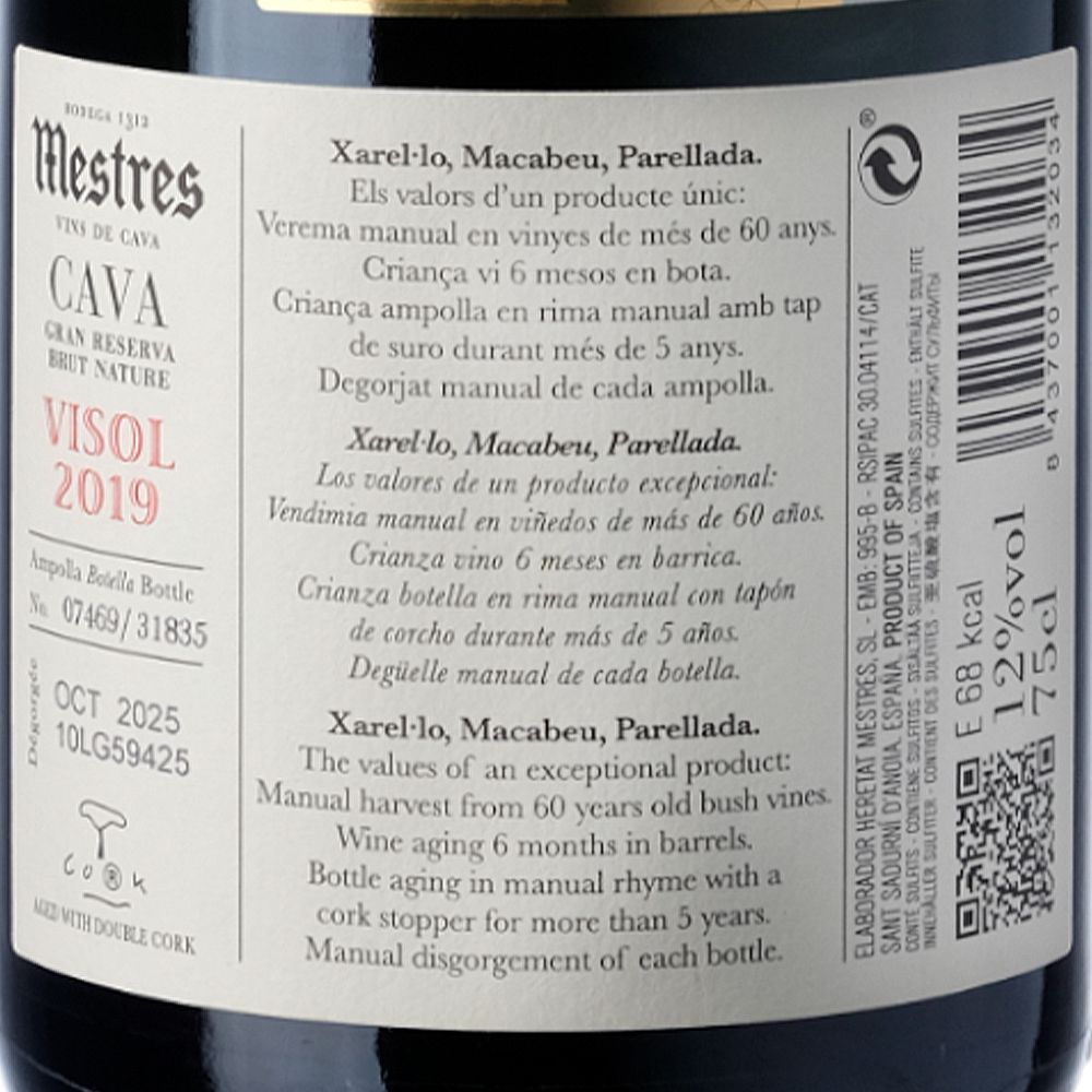 El Mestres Visol Gran Reserva Brut Nature 2019 es un cava de la D.O. Cava, elaborado con las variedades tradicionales Macabeo, Parellada y Xarel·lo. Este cava proviene de una tradición familiar que se remonta a 1312, con viñedos propios en Sant Sadurní d’Anoia, donde el compromiso con la excelencia ha guiado la producción de sus reconocidos espumosos.