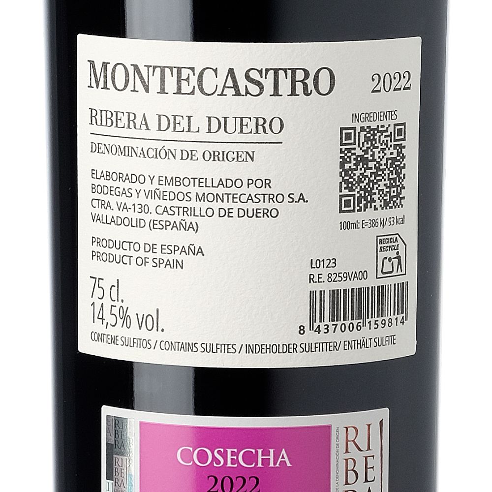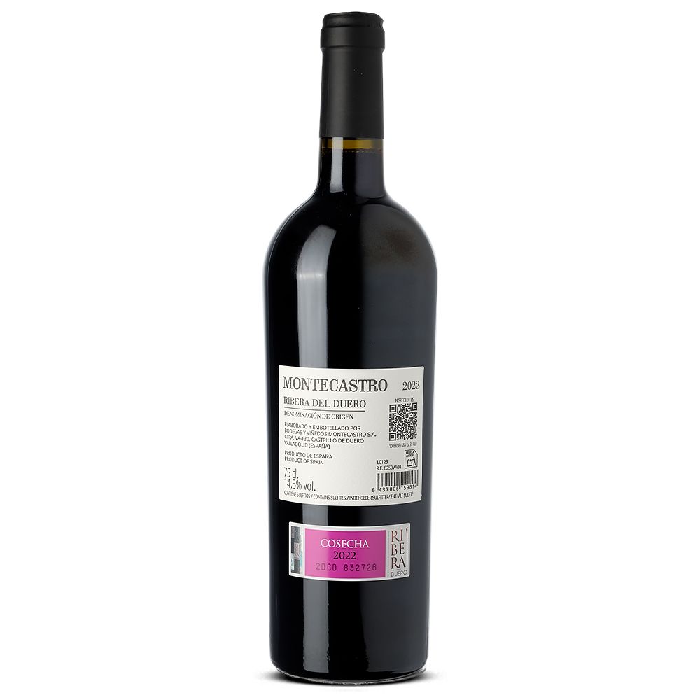 Montecastro 2021 es un vino tinto seco elaborado con un 95 % Tempranillo y un 5 % Cabernet Sauvignon, amparado por la D.O. Ribera del Duero. Procede de un viñedo privilegiado situado entre los 860 y 930 metros sobre el nivel del mar, en una de las zonas más elevadas de la denominación. Sus suelos, mayoritariamente calcáreos, aportan frescura y estructura al vino. La bodega trabaja bajo criterios de respeto medioambiental, evitando el uso de pesticidas y controlando rigurosamente los rendimientos para garantizar la máxima calidad.