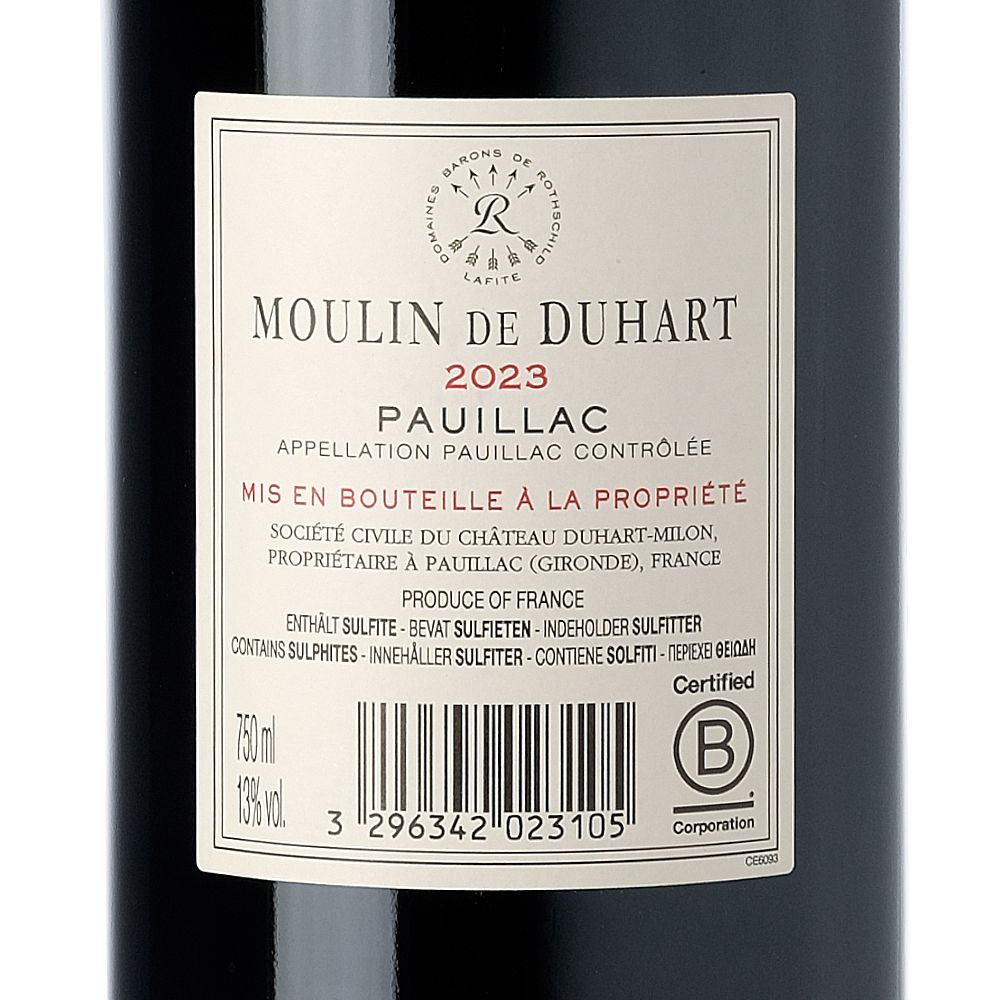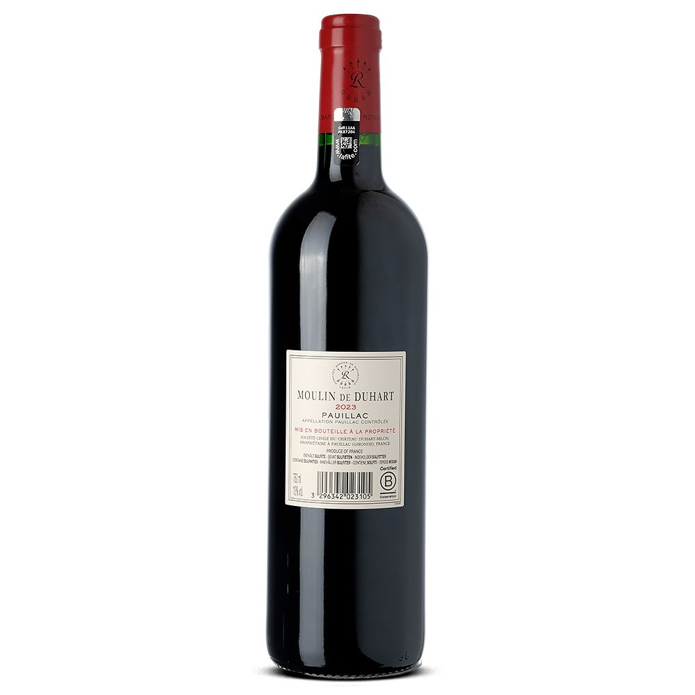 Moulin De Duhart 2023 es un vino tinto seco elaborado por el prestigioso Château Duhart-Milon en la denominación AOC Pauillac, ubicada en la célebre región de Burdeos, Francia. Situado en la orilla izquierda del estuario de la Gironda, a unos 40 km al norte de Burdeos, Pauillac se beneficia de un clima templado y una diversidad de suelos excepcionales, originados en el Macizo Central y los Pirineos, que proporcionan las condiciones ideales para la creación de vinos de alta calidad.