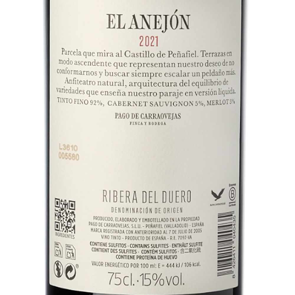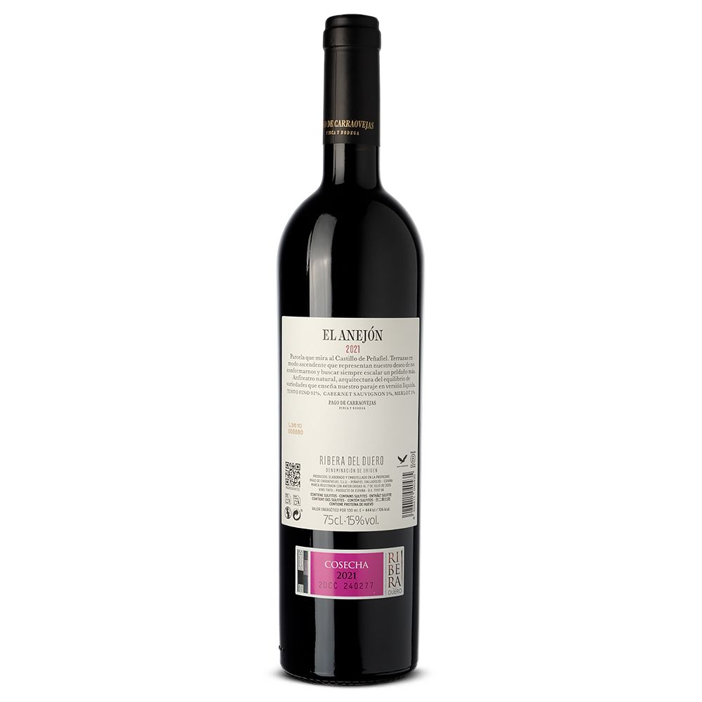 El Anejón 2021 es un distinguido vino tinto seco, creado con una mezcla de Tinto Fino (92%), Cabernet Sauvignon (5%) y Merlot (3%) por la reconocida bodega Pago de Carraovejas en la D.O. Ribera del Duero. Este vino emana un carácter sutil y robusto, destacando por su aromático bouquet floral que captura la esencia excepcional de su viñedo originario.