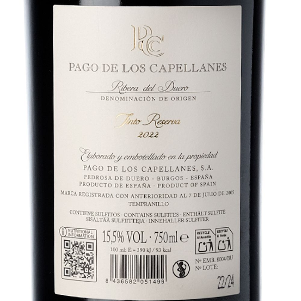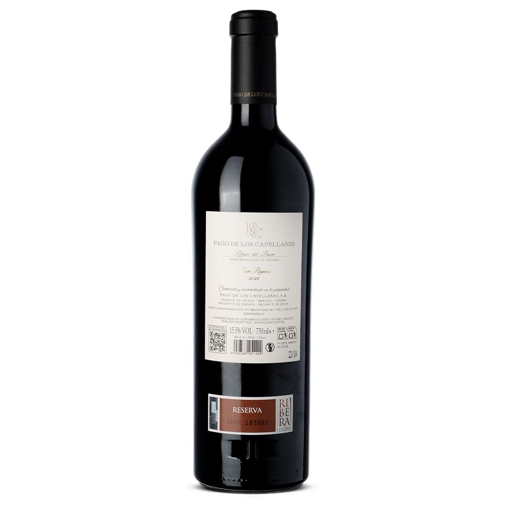 Pago de los Capellanes Reserva 2022 es un vino tinto de gran elegancia, elaborado exclusivamente con Tempranillo en la prestigiosa D.O. Ribera del Duero. Creado por la bodega Pago de los Capellanes, ubicada en el pintoresco pueblo de Pedrosa de Duero, Burgos, este vino representa el legado y la pasión vinícola de la familia Rodero Villa, cuyo compromiso con la excelencia ha convertido su proyecto en un referente enológico.