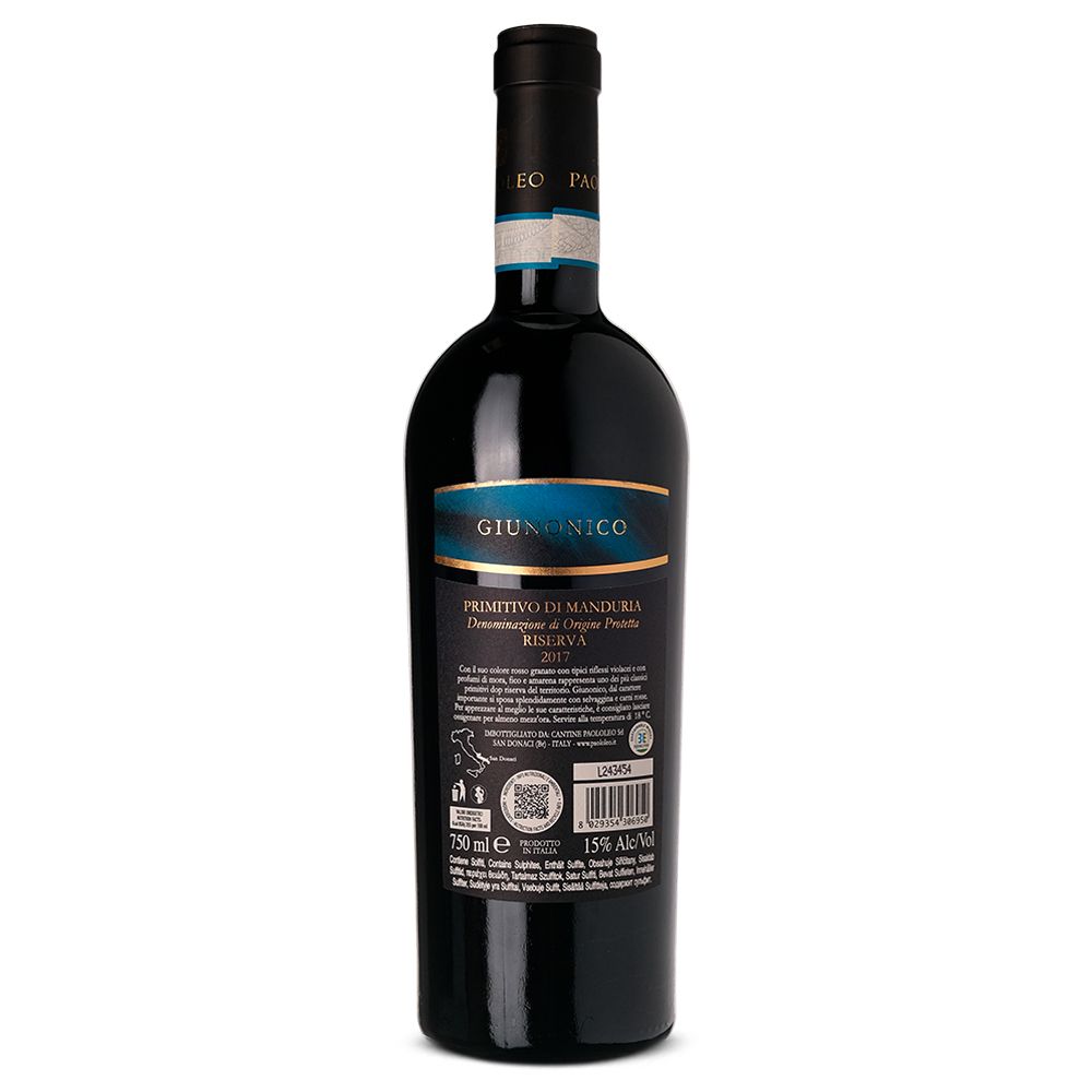 El Paolo Leo Giunonico Primitivo di Manduria Riserva 2017 es un vino tinto seco elaborado con la variedad Primitivo bajo la DOC Primitivo di Manduria (Puglia, Italia). El Primitivo, con orígenes antiguos y gran prestigio, encuentra en la zona de Manduria su máxima expresión, gracias a los días soleados y las marcadas diferencias térmicas nocturnas que permiten obtener uvas de maduración óptima, dando lugar a vinos intensos, sedosos y estructurados.