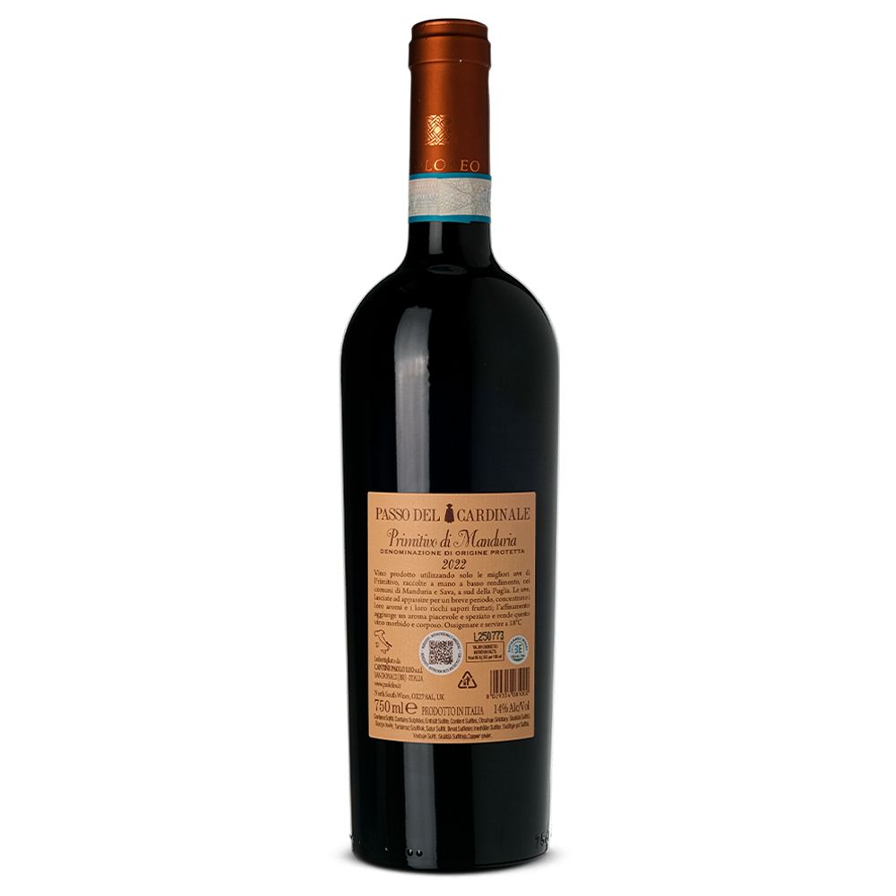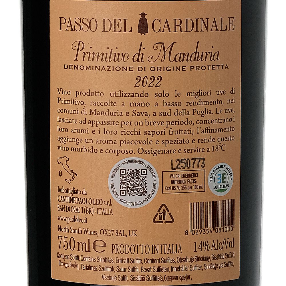 El Paolo Leo Passo del Cardinale Primitivo di Manduria 2022 es un vino tinto seco elaborado con la uva Primitivo, bajo la DOC Primitivo di Manduria (Puglia, Italia). Esta variedad ancestral es reconocida por dar vida a vinos de gran prestigio, y en Manduria alcanza su máxima expresión gracias a sus largos días soleados y las fuertes diferencias térmicas entre el día y la noche, que favorecen una maduración óptima de la uva. El resultado es un vino de estructura elegante, suavidad y gran carácter.