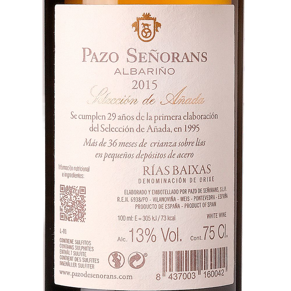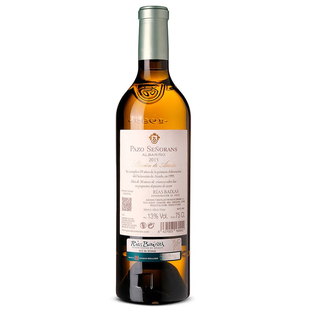 El Pazo Señorans Selección de Añada 2015 es un vino blanco seco elaborado con Albariño bajo la prestigiosa D.O. Rías Baixas. La bodega Pazo Señorans, situada en una señorial casa solariega del siglo XVI, lanzó su primera cosecha en 1989 y desde entonces se ha convertido en un referente indiscutible de la zona.