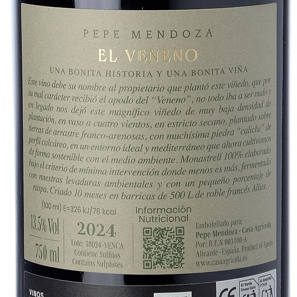 Pepe Mendoza Casa Agrícola El Veneno 2024 es un vino tinto seco elaborado exclusivamente con Monastrell bajo la D.O.P. Alicante. Pepe Mendoza trabaja actualmente 31 hectáreas de viñedo propio: 12 hectáreas de viejas cepas de Giró y Moscatel en Llíber (Marina Alta), 10 hectáreas de Monastrell de 45 años en la zona de Villena y Pinoso, y otras 9 hectáreas más jóvenes de Macabeo, Monastrell, Viognier y Alicante Bouschet. Además, continúa ampliando su patrimonio vitícola con la adquisición de nuevas parcelas de Monastrell vieja, reforzando así su apuesta por la identidad y el terruño.