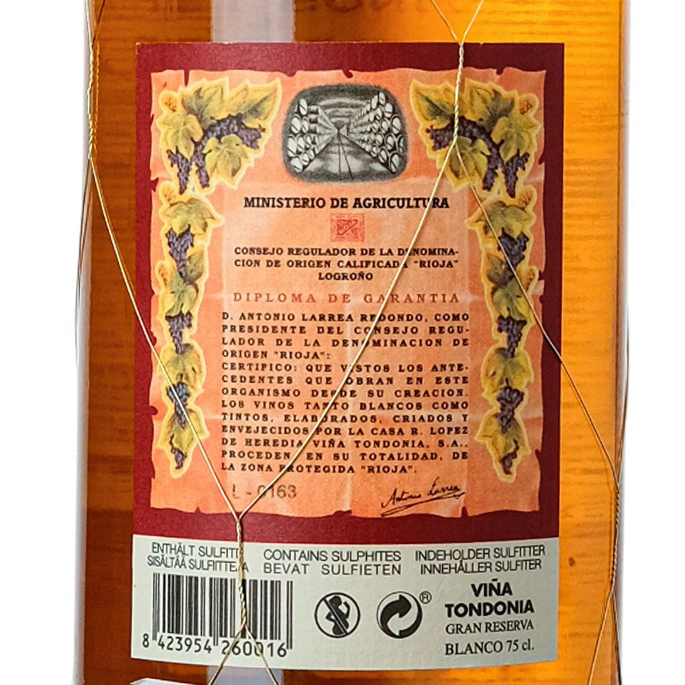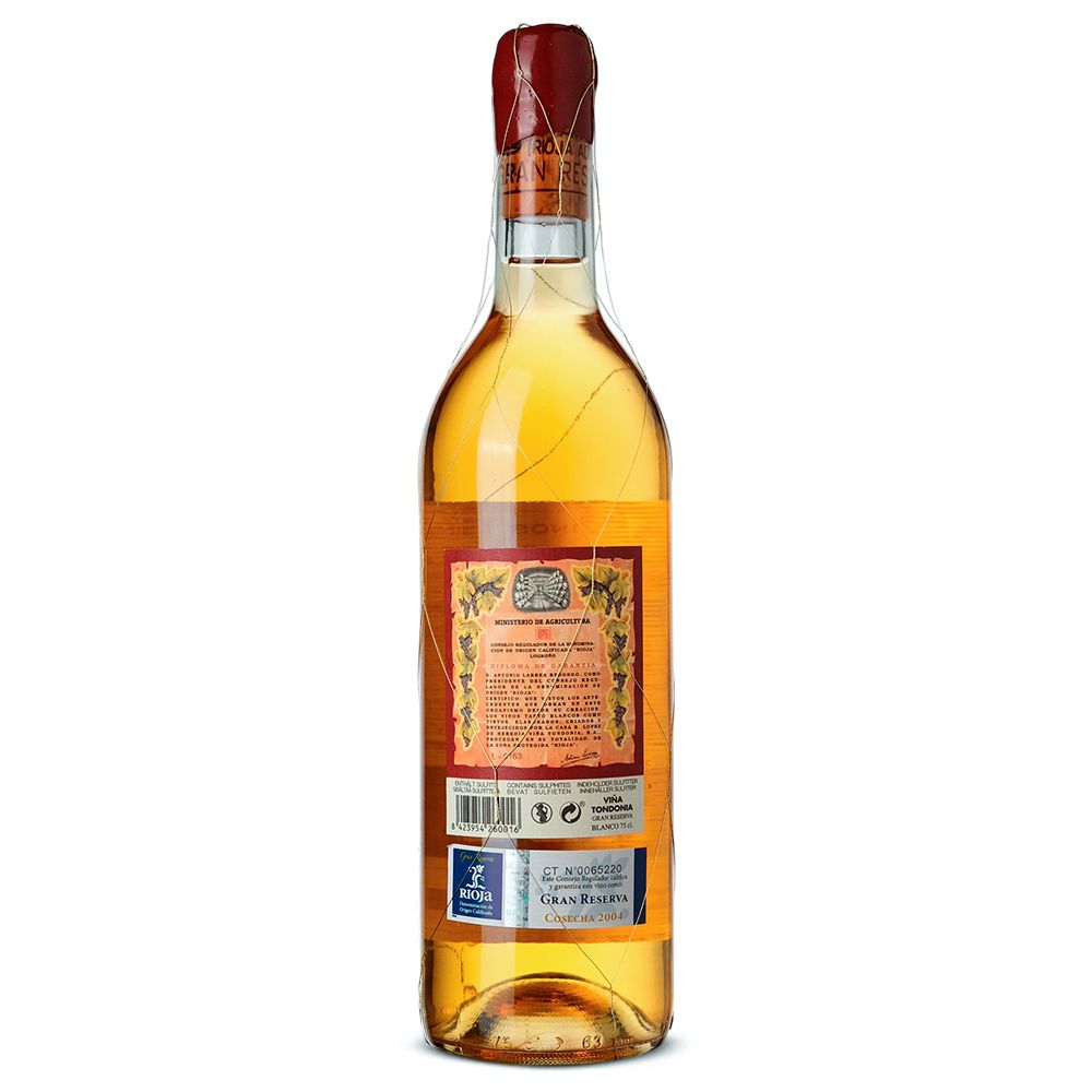 R. López de Heredia Viña Tondonia Gran Reserva Blanco 2004 es un vino blanco excepcional de la D.O.Ca. Rioja, elaborado con una combinación clásica de Viura (90%) y Malvasía (10%), procedentes de los viñedos propios de la bodega. El mítico viñedo de Viña Tondonia, plantado en 1913-1914 por Don Rafael López de Heredia y Landeta, se ha convertido en el emblema más célebre de la casa. Con más de 100 hectáreas situadas en la margen derecha del río Ebro, sus cepas producen uvas que expresan con fidelidad el carácter más auténtico de Rioja.