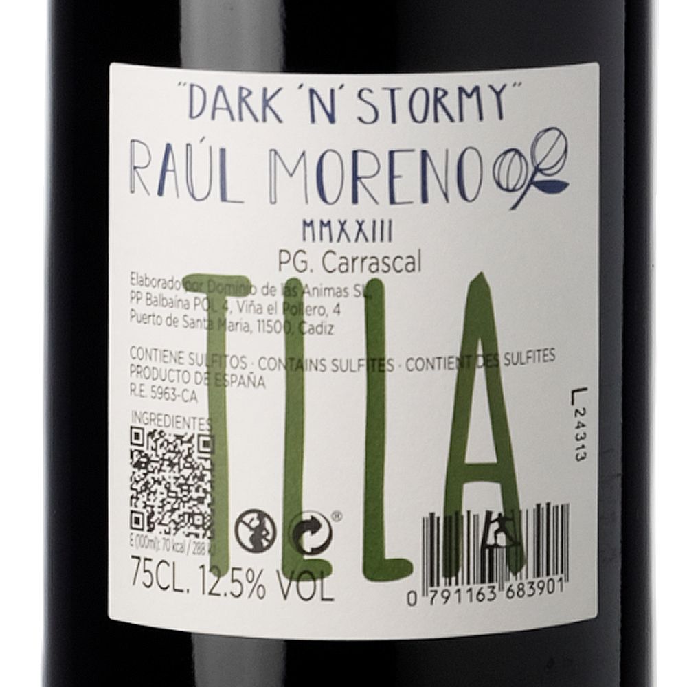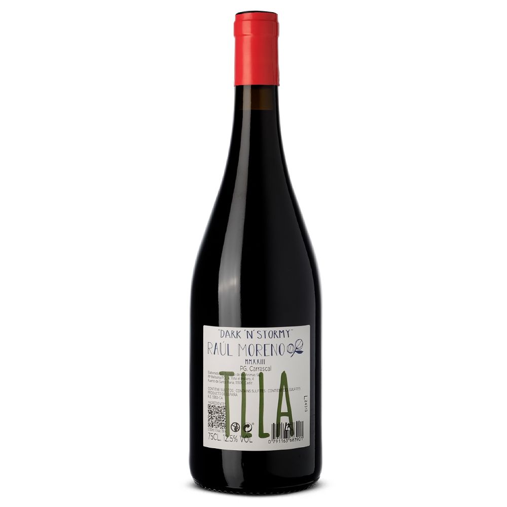 Dark ’n Stormy 2023 es un vino tinto seco elaborado exclusivamente con la variedad Tintilla de Rota por Raúl Moreno, un enólogo sevillano de amplia trayectoria internacional, reconocido por su enfoque personal y de mínima intervención. Su trabajo se centra en crear vinos singulares que esconden el secreto de unir tradición y vanguardia, especialmente a partir de viñedos antiguos y de cultivo orgánico en el Marco de Jerez —Jerez y Sanlúcar de Barrameda—. En sus elaboraciones conviven uvas autóctonas como Palomino con variedades internacionales, aplicando técnicas históricas como la crianza bajo flor o el uso de ánforas, junto a métodos contemporáneos que desafían los límites clásicos de la región.