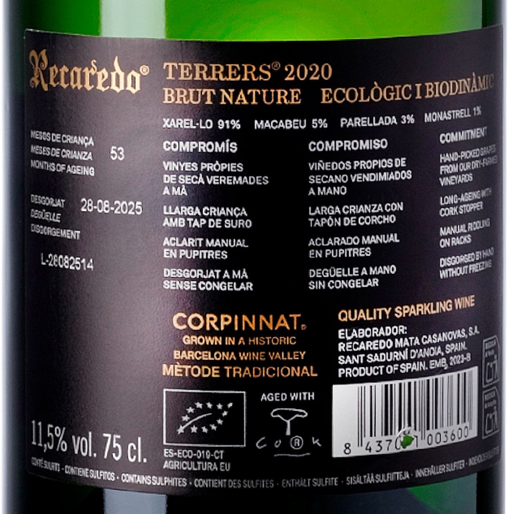 Recaredo Terrers Brut Nature Corpinnat 2020 es un vino espumoso excepcional, elaborado con un ensamblaje de 91 % Xarel·lo, 5 % Macabeu, 3 % Parellada y 1 % Monastrell, por la prestigiosa bodega Recaredo, situada en el corazón de Corpinnat (Penedès). La historia de Recaredo se remonta a 1924, cuando Josep Mata Capellades, en su pueblo natal Sant Sadurní d’Anoia, abandonó la tradición familiar de la cerámica para dedicarse a la elaboración de vinos espumosos de alta calidad. Este paso visionario marcó el inicio de un legado que, tres generaciones después, sigue siendo sinónimo de excelencia, autenticidad y profundo respeto por la tierra.