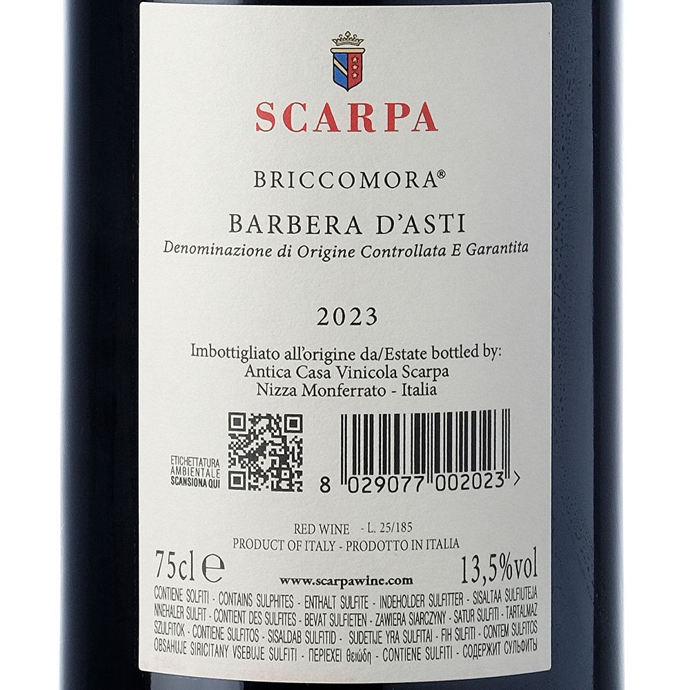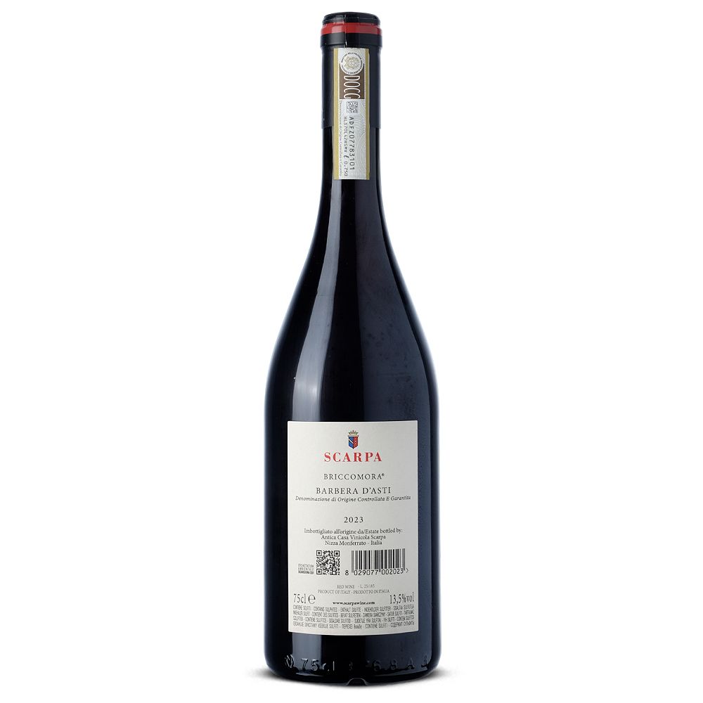 Briccomora Barbera d’Asti 2023 es un vino tinto seco de gran personalidad, elaborado íntegramente con uvas Barbera procedentes del corazón del Piemonte, Italia, por la prestigiosa bodega Scarpa. Este vino representa la autenticidad del terroir piamontés, combinando tradición, precisión y carácter.