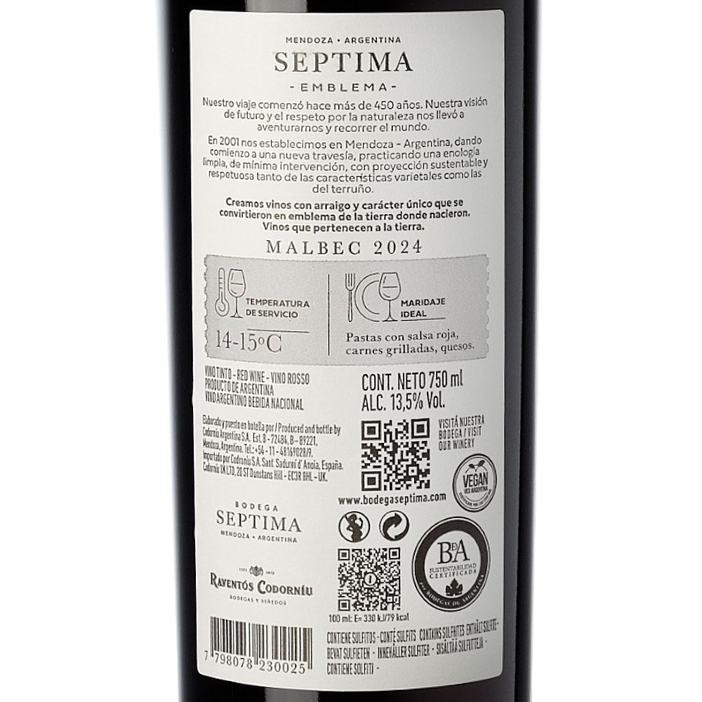 Séptima Emblema Malbec 2024 es un vino tinto seco elaborado exclusivamente con Malbec procedente de Agrelo, en Mendoza, Argentina. Este proyecto nace del espíritu innovador de la familia Raventós Codorníu, impulsada por la firme creencia de que cada terruño es irrepetible. Esa visión los llevó al Nuevo Mundo, donde descubrieron un enclave excepcional en plena montaña y revelaron el secreto de unos terruños vitivinícolas de enorme potencial.