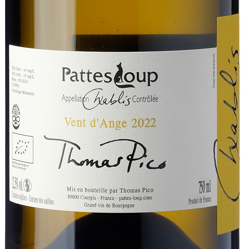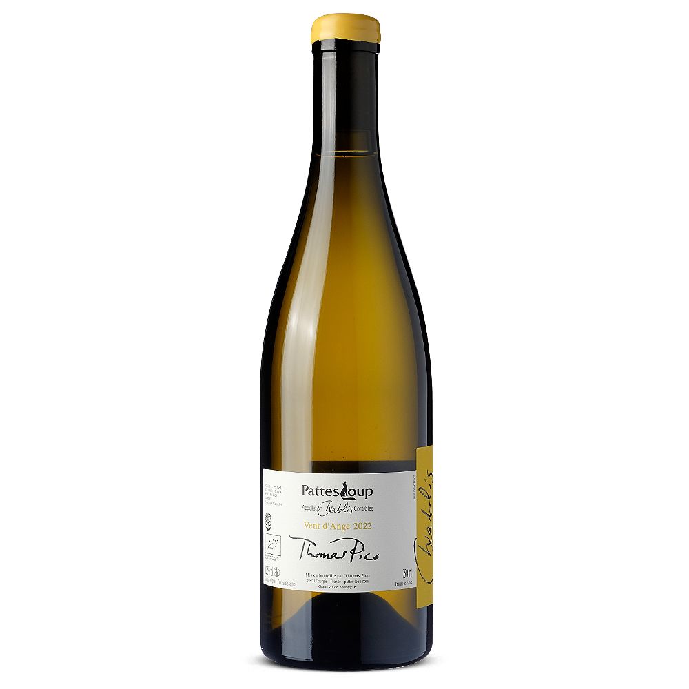 Domaine Pattes Loup Chablis Vent d’Ange 2022 es un vino blanco seco excepcional, elaborado a partir de uvas Chardonnay en la prestigiosa AOC Chablis, en el corazón de Borgoña. Este vino refleja el compromiso del viticultor Thomas Pico, quien dirige el Domaine Pattes Loup bajo una filosofía de viticultura ecológica, priorizando tanto la sostenibilidad del entorno como el bienestar de quienes lo disfrutan.