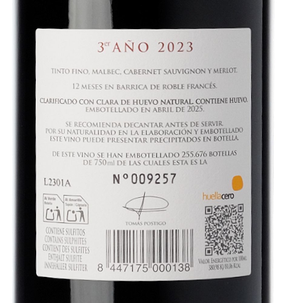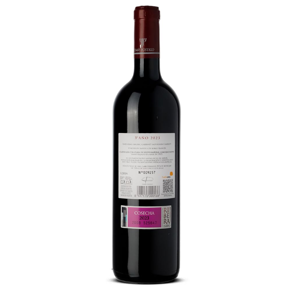 Tomás Postigo 3er Año 2023 se destaca entre los destacados vinos de Ribera del Duero, creado por la prestigiosa Bodega Tomás Postigo. Las uvas son cuidadosamente seleccionadas de pequeñas fincas distribuidas en diversas localidades de la Ribera del Duero, situadas entre 750 y 1010 metros de altitud. Aunque los suelos varían, la calidad es innegable. Este coupage, anteriormente conocido como Tomás Postigo Crianza, está principalmente compuesto por Tinto fino (tempranillo), Cabernet Sauvignon, Merlot y Malbec.