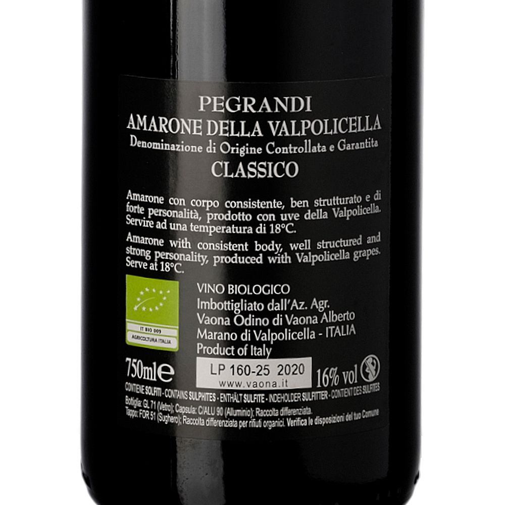 Vaona Pegrandi Amarone della Valpolicella 2020 es un vino tinto seco de alta gama que refleja la tradición vitivinícola de la región DOCG Amarone della Valpolicella Classico, en Véneto, Italia. Este prestigioso Amarone está elaborado con una mezcla única de Corvina (30%), Corvinone (35%), Rondinella (25%), Molinara (5%) y Raboso Veronese (5%), lo que demuestra la pasión y el sabor de hacer el Familia Vaona, cuyas generaciones se han dedicado a perfeccionar sus vinos en el municipio de Marano di Valpolicella.