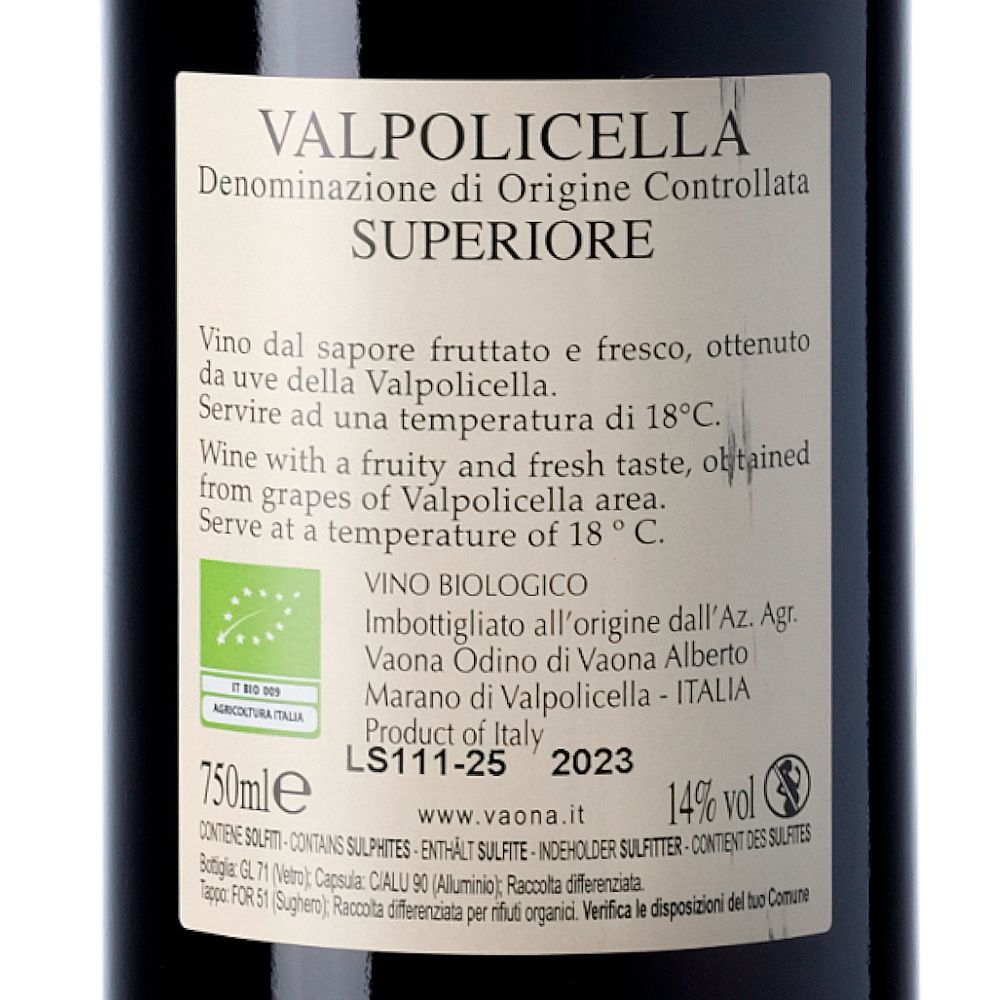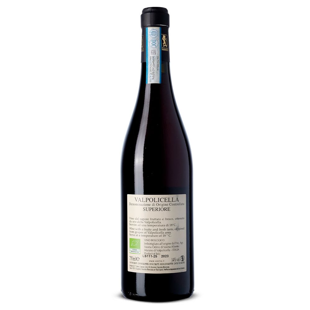 Vaona Valpolicella Superiore 2023 es un vino tinto seco que combina las variedades tradicionales Corvina, Corvinone, Rondinella y Molinara, elaborado por la prestigiosa bodega Vaona en la denominación DOC Valpolicella, ubicada en Veneto, Italia. Esta histórica bodega, enclavada en el corazón de Valpolicella Clásica, se distingue por mantener viva la tradición vitivinícola de la región. Desde su fundación en el siglo XVII, la familia Vaona ha dedicado generaciones a la creación de icónicos vinos como Recioto y Amarone, preservando los métodos tradicionales que han dado fama a sus etiquetas.